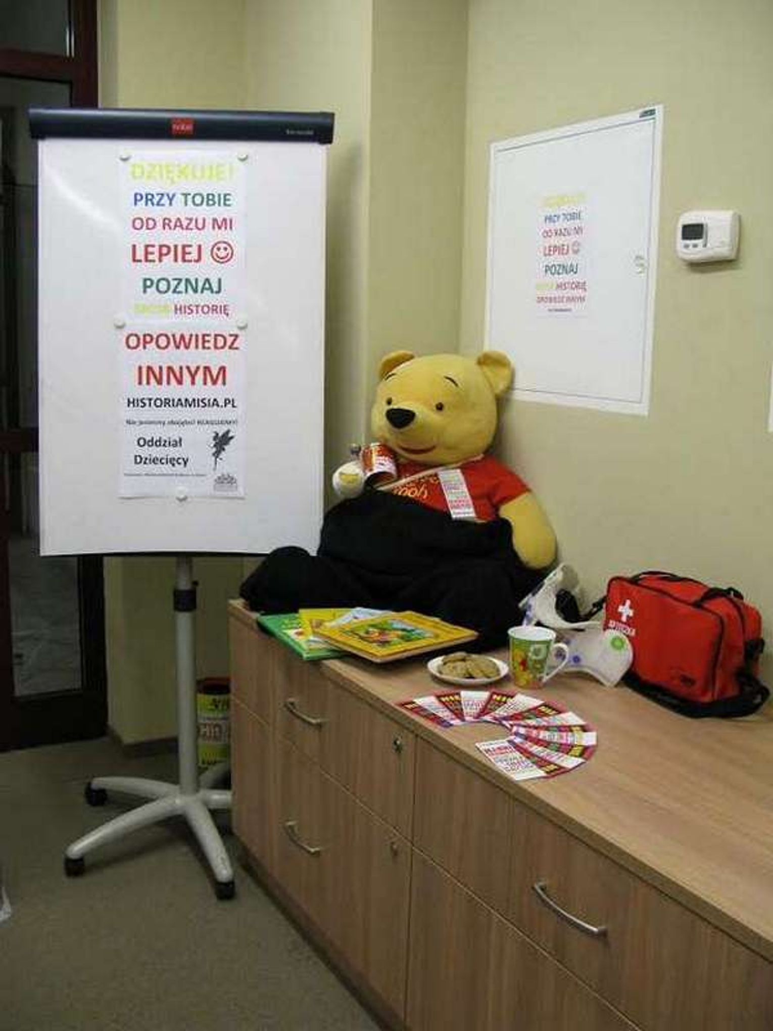 Kubuś Puchatek już czuje się lepiej, dostał ciepły kocyk, porcję miodku, ciasteczka na śniadanko i kakao w kubusiowym kubeczku. Żeby zrobiło mu się lepiej, przeczytałyśmy mu piękne misiowe opowieści. Teraz uśmiecha się do Nas z wdzięcznością i jest to dla Nas najpiękniejsza nagroda. Możecie go kochane dzieci odwiedzić w Oddziale Dziecięcym Powiatowej i Miejskiej Biblioteki Publicznej i niech to będzie wasza reakcja, Wy też macie wielką moc zmieniania rzeczywistości.