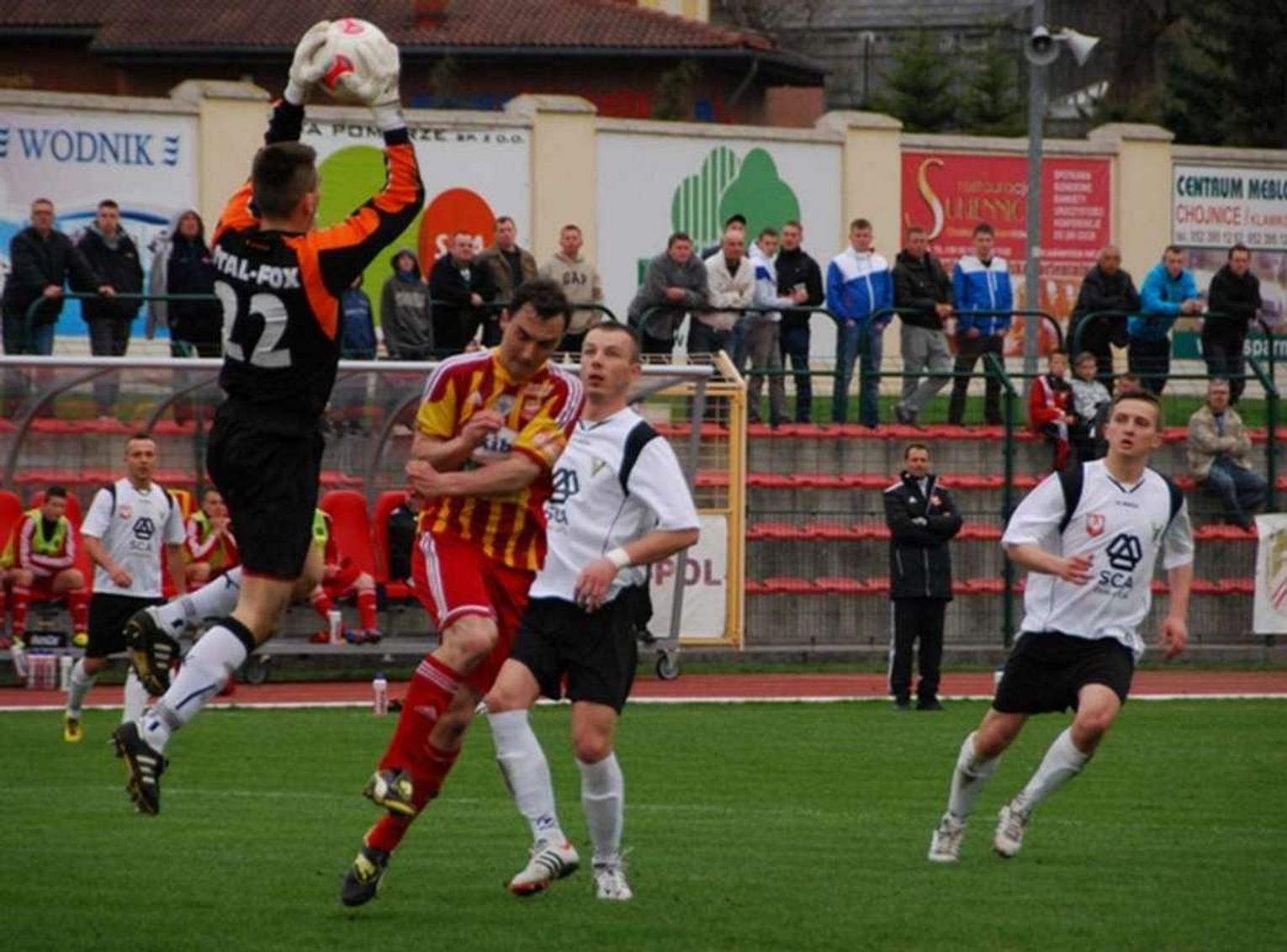 Piłkarze walczącej o pierwszoligowy awans Chojniczanki nie spodziewali się tak silnego oporu oławskiej drużyny, którą jesienią pokonali na wyjeździe aż 4:1. Z minuty na minutę grali więc coraz bardziej nerwowo i rzadko stwarzali sobie sytuacje do strzelenia goli. Najczęściej mieli je po rzutach rożnych lub wolnych, których koniński arbiter Tomasz Zieliński podyktował w tym meczu niezliczoną ilość. Praktycznie każdy kontakt rywala z przeciwnikiem, który miał piłkę, był przez sędziego odgwizdywany jako przewinienie. Pierwszą klarowną sytuację strzelecką z akcji gospodarze mieli dopiero w 13 minucie. Któryś z chojnickich pomocników przechwycił piłkę, zbyt słabo wybitą przez Radosława Florczyka, i podał na pole karne do Krystiana Feciucha. Ten wyłożył futbolówkę Danielowi Ferudze, który huknął z 16 metrów, ale nad poprzeczkę.