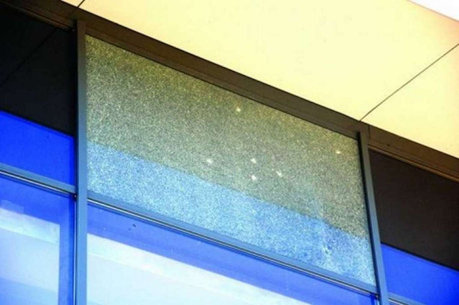 Na szybach nowo budowanej krytej pływalni widać ślady po strzałach