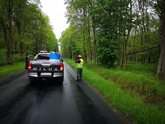 Drogowcy przycinają niebezpieczne konary drzew wystające nad jezdnię. Droga jest nieprzejezdna w obu kierunkach, czyli także z Jelcza-Laskowic do Janikowa.