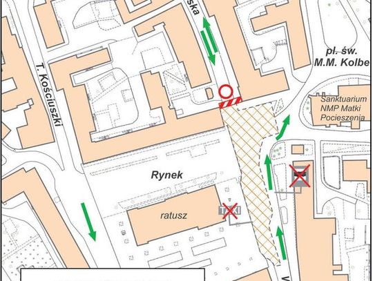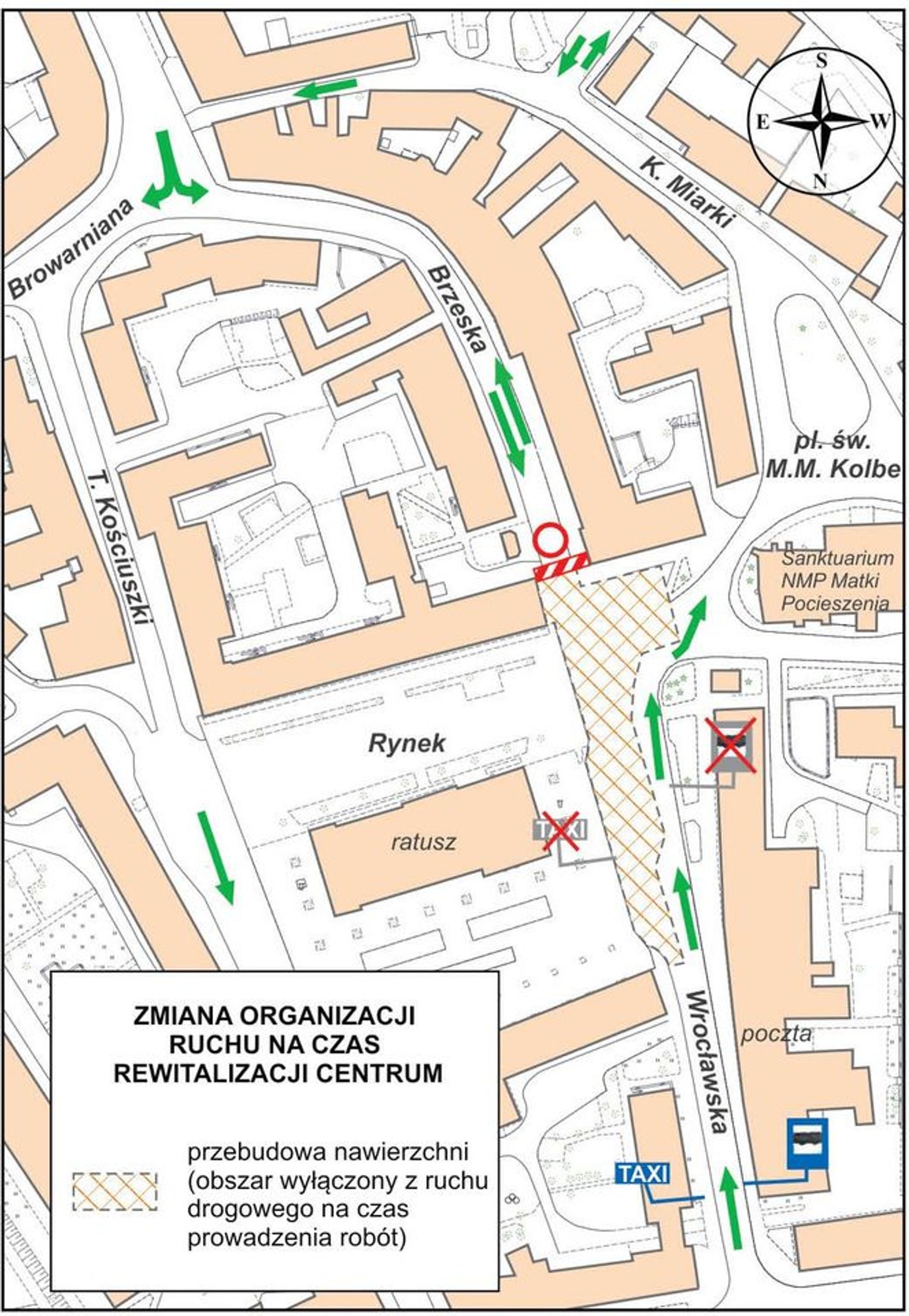 Wyjazd z Rynku w kierunku ul. 11 Listopada i 1 Maja będzie możliwy przez Pl. M.M. Kolbego i ul. K. Miarki. Dotychczasowy przystanek autobusowy oraz postój taksówek w Rynku będą przeniesione na ul. Wrocławską. Przepraszamy za wszelkie niedogodności związane z prowadzoną inwestycją. Prosimy o wyrozumiałość i cierpliwość.