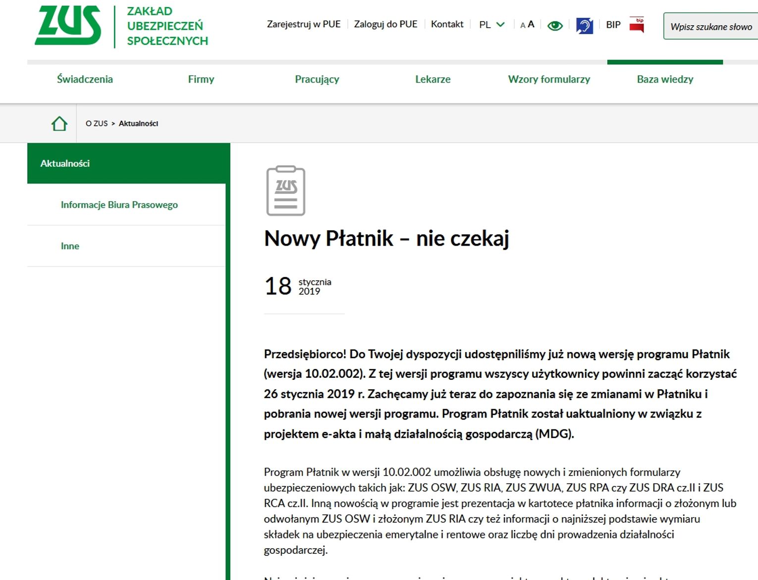 25 stycznia przestaje obowiązywać stara wersja programu Płatnik (10.01.001), tym samym zostaje ona przez Zakład Ubezpieczeń Społecznych zablokowana. Od 26 stycznia 2019 obowiązywać będzie tylko wersja 10.02.002, którą każdy musi pobrać samodzielnie.