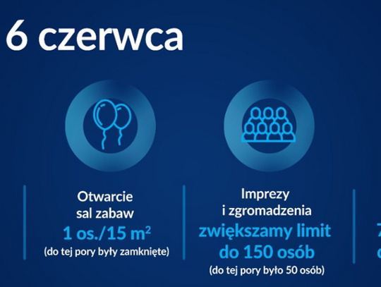 Od 6 czerwca można organizować wesela i zgromadzenia do 150 osób, a także targi i konferencje przy zachowaniu limitu – 1 osoba na 15 m2. Otwarte zostaną również sale zabaw dla dzieci. Z transportu publicznego będzie mogło skorzystać więcej pasażerów.