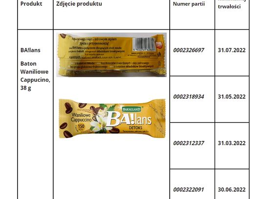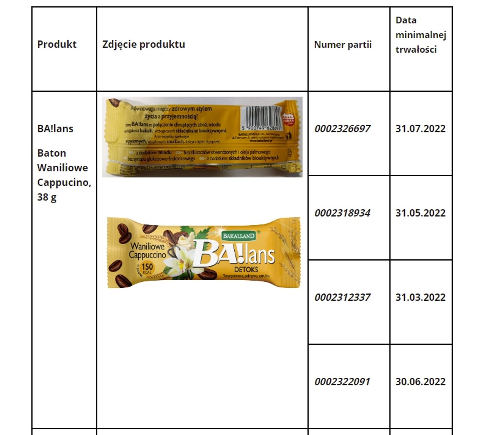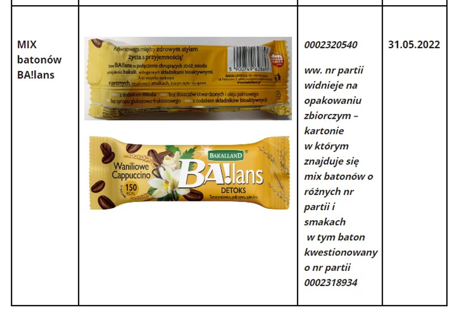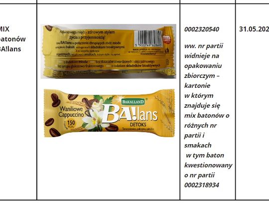 Firma Bakalland S.A. rozpoczęła wycofywanie batonów, do których został użyty kwestionowany surowiec. Państwowy Powiatowy Inspektor Sanitarny w Białej Podlaskiej wydał decyzję administracyjną nakazującą wycofanie wskazanych partii produktów z obrotu handlowego. Organy Państwowej Inspekcji Sanitarnej monitorują wycofanie kwestionowanych partii produktu z obrotu w Polsce. Zalecenia dla konsumentów: Nie należy spożywać partii produktu wskazanych poniżej.