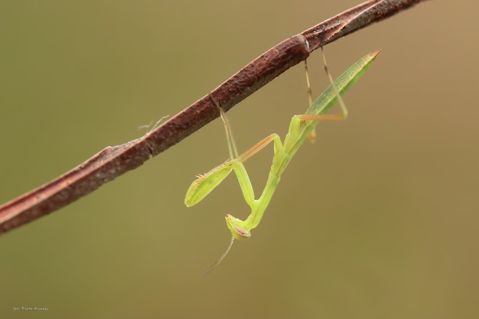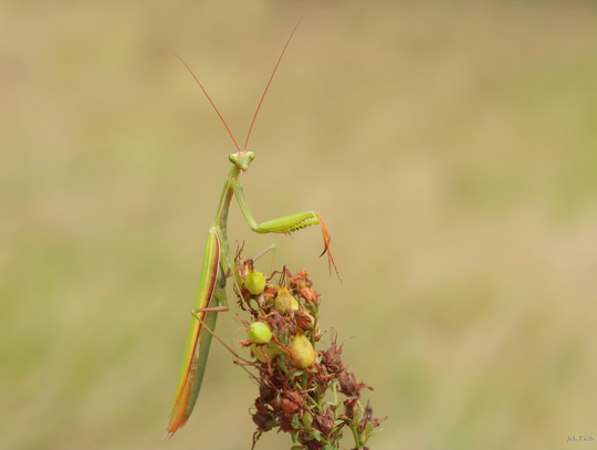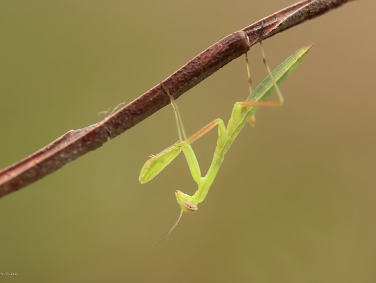 Na śródleśnych polanach powiatu oławskiego spotkamy już modliszkę zwyczajną (Mantis religiosa). Na chwilę obecną są maleńkie (długości paznokcia do 1 cm), ale równie skuteczne w polowaniu co owady dorosłe, które pojawią się we wrześniu. Oczywiście jesteśmy w stanie określić płeć. Widzimy więc samiczkę czy samca ? To pytanie do mieszkańców.