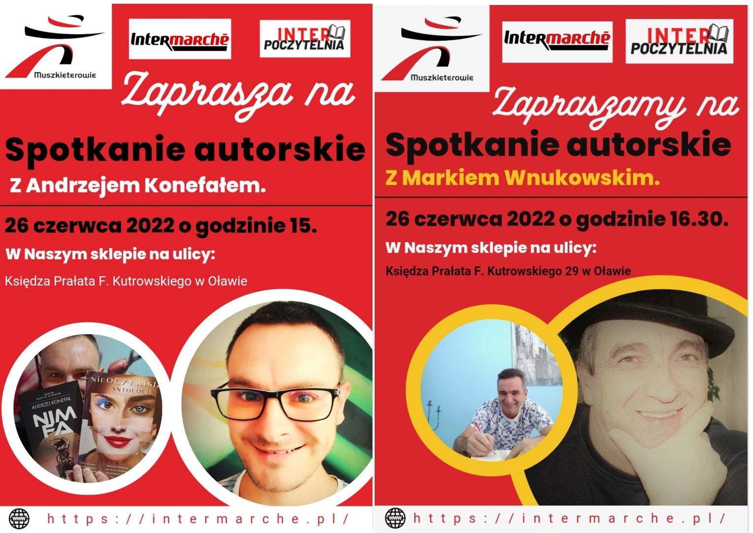 Spotkania odbędą się w tym samym dniu w Intermarche w Jelczu-Laskowicach! O godz. 11.00 z Andrzejem Konefałem a o godz. 12.30 z Markiem Wnukowskim. A o godz. 15.00 i 16.30 w Oławie!