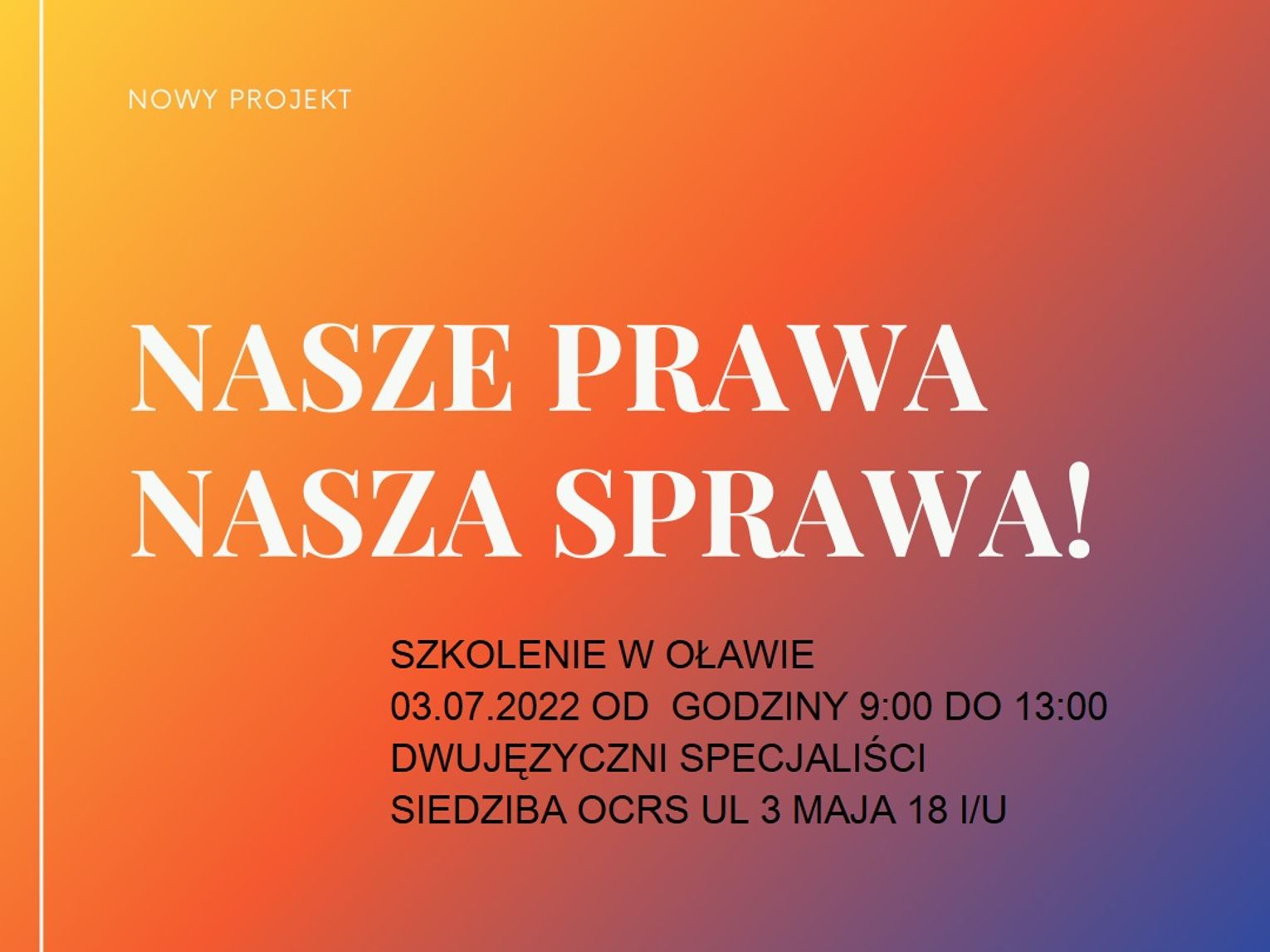 Асоціація "Номада" та Асоціація "Нижньосілезький конгрес жінок" сердечно запрошують українських чоловіків та жінок, які проживають в Олавському районі, взяти участь у тренінгу з імміграційного права та інших аспектів життя у Польщі (медичні, страхові, офіційні питання).
