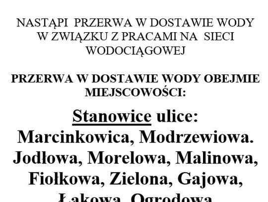 W piątek planowana jest przerwa w dostawie wody w Stanowicach i Marcinkowicach