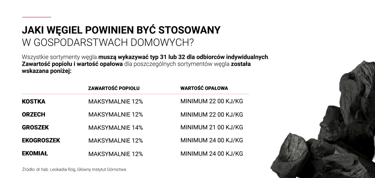Oczywiście na wartość opałową węgla istotny wpływ ma zawartość wilgoci całkowitej i popiołu w węglu. Czym większa zawartość popiołu i wilgoci w węglu tym mniejsza jego wartość opałowa. Według rozporządzenia Kostka i Orzech powinny wykazywać zawartość popiołu maksymalnie 12% i wartość opałową nie mniejszą niż 22 000 kJ/kg. Groszek powinien mieć maksymalnie 14% popiołu i wartość opałową nie mniejszą niż 21 000 kJ/kg. Ekogroszek, czyli paliwo predystynowane do stosowania w kociołkach domowych powinno charakteryzować się zawartością popiołu maksymalnie 12% i wartością opałową nie mniejszą niż 24 000 kJ/kg. Jest jeszcze jeden sortyment, który może być stosowany w instalacjach poniżej 1 MW i w gospodarstwach domowych – ekomiał. Ekomiał, podobnie jak ekogroszek, powinien wykazywać zawartość popiołu maksymalnie 12% i wartość opałową nie mniejszą niż 24 000 kJ/kg, a zawartość ziaren o średnicy poniżej 3 mm nie powinna przekraczać w nim 15%.