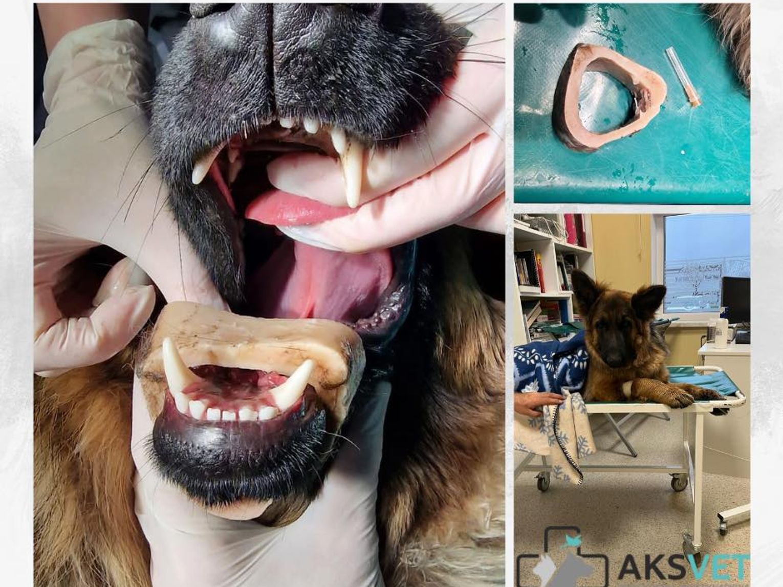 Jej opiekun przyjechał do nas nieumówiony, bo naprawdę zaskoczyła go ta sytuacja. Nie pierwszy jego owczarek i nie pierwsza kość do zabawy, ale tym razem niestety nie obyło się bez interwencji lekarzy naszej przychodni. Na szczęście przy odpowiednim znieczuleniu udało się ściągnąć kość bez konieczności nacinania - w imię zasady, skoro udało się włożyć, musi się udać ściągnąć