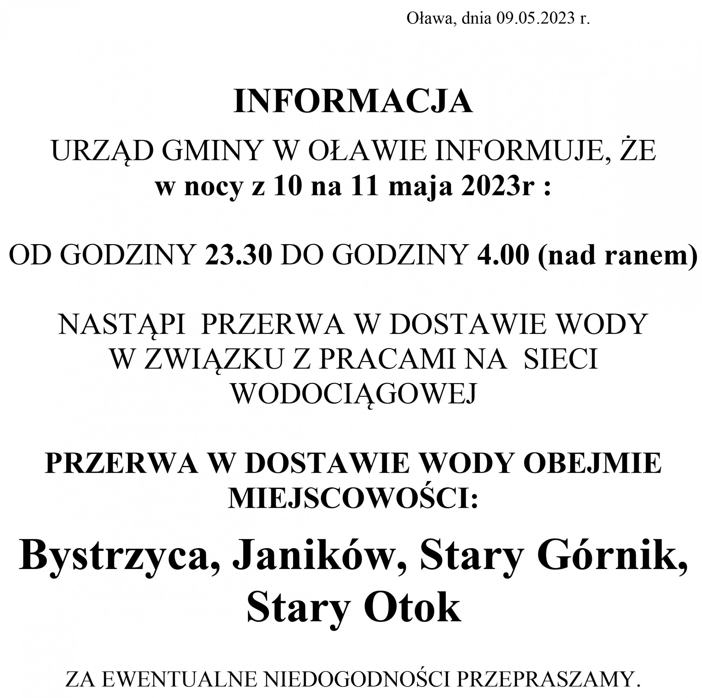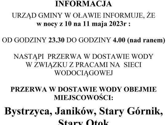 Gmina Oława informuje mieszkańców o przerwie w dostawie wody. Dotyczy to czterech wsi