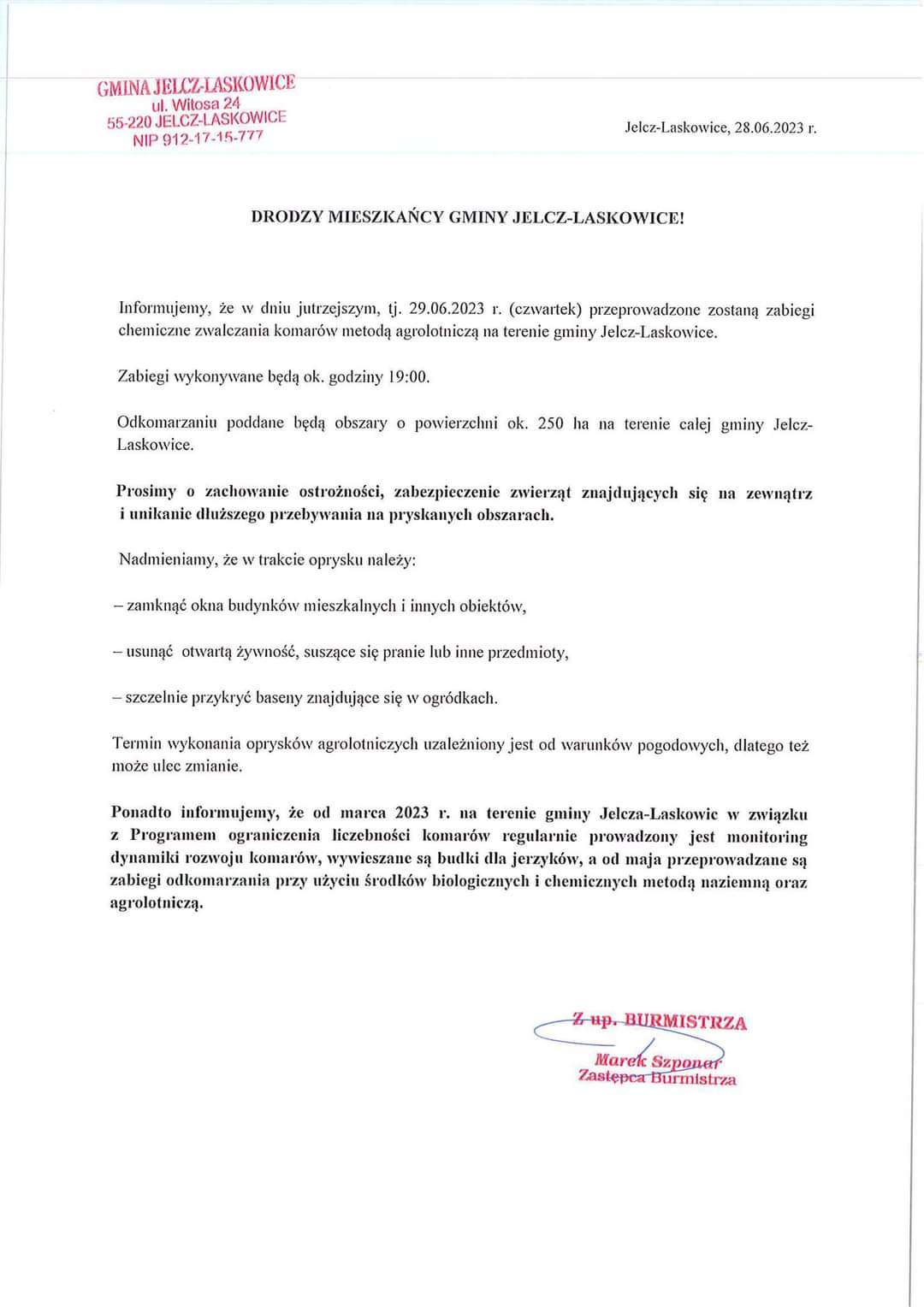 Uwaga, w czwartek 29 czerwca około godziny 19.00 zostaną przeprowadzone opryski na komary na terenie gminy J-L. Mieszkańcy proszeni są o zamykanie okien, zabezpieczenie ogrodowych basenów i żywności.