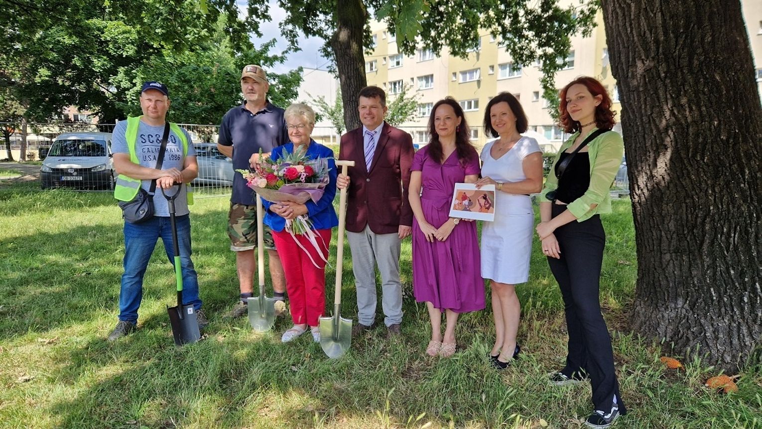 Dziś na Skwerze Adama Wójcika odbyła się uroczystość, podczas której Helena Wójcik wraz z synem Marianem dokonali symbolicznego wbicia łopaty, rozpoczynając tym samym roboty budowlane przy zagospodarowaniu skweru.