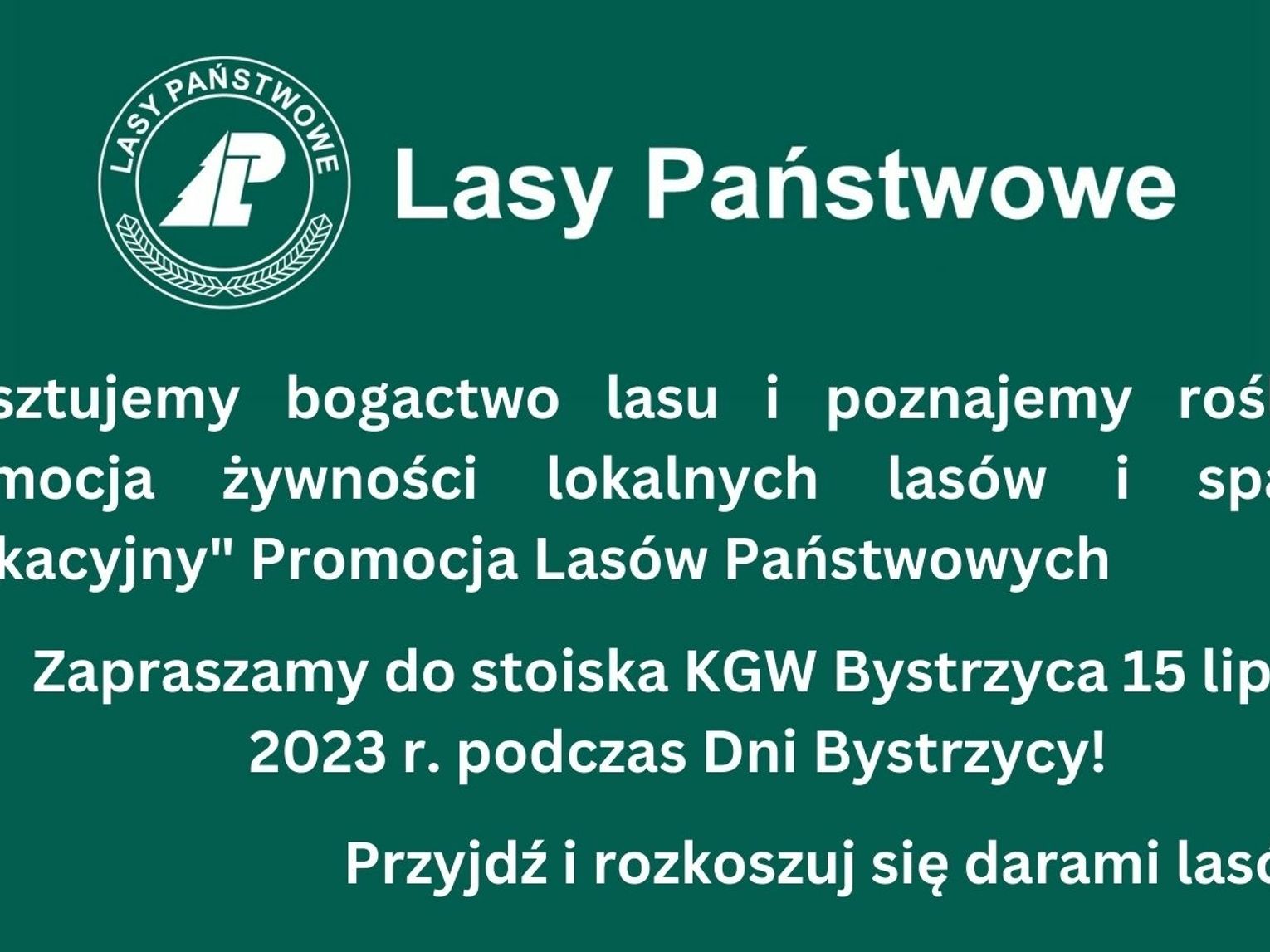 Wydarzenie pt. „Kosztujemy bogactwo lasu i poznajemy rośliny. Promocja żywności lokalnych lasów i spacer edukacyjny” realizowane przez KGW w Bystrzycy, w ramach „Kon-kursu dla Kół Gospodyń Wiejskich o dofinansowanie na promocję Lasów Państwowych”.
