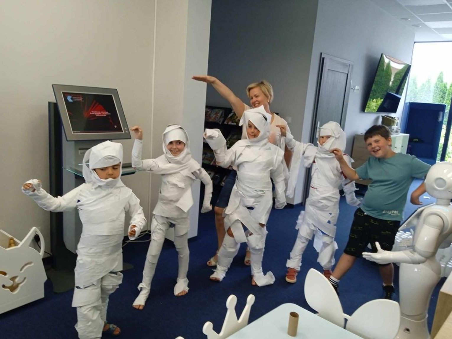 To odbywały się pierwsze zajęcia z cyklu "Wakacje z książką". Temat - Starożytny Egipt na podstawie książek K. Gatier i S. Vernet ,,Panika w Egipcie" oraz M. Widmark i H. Willis ,,Tajemnice mumii". Uczestnicy poznawali tajniki hieroglifów, mumii i piramid. Z tej okazji w bibliotece zamieszkało na chwilę kilka mumii oraz powstało kilka okazałych piramid.