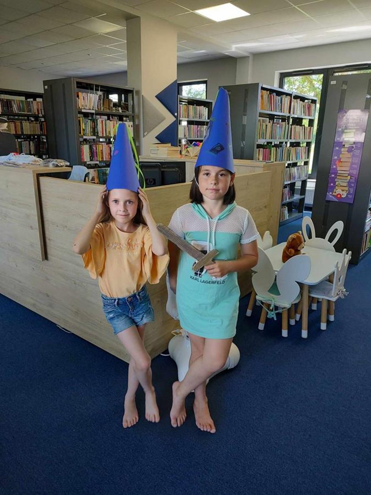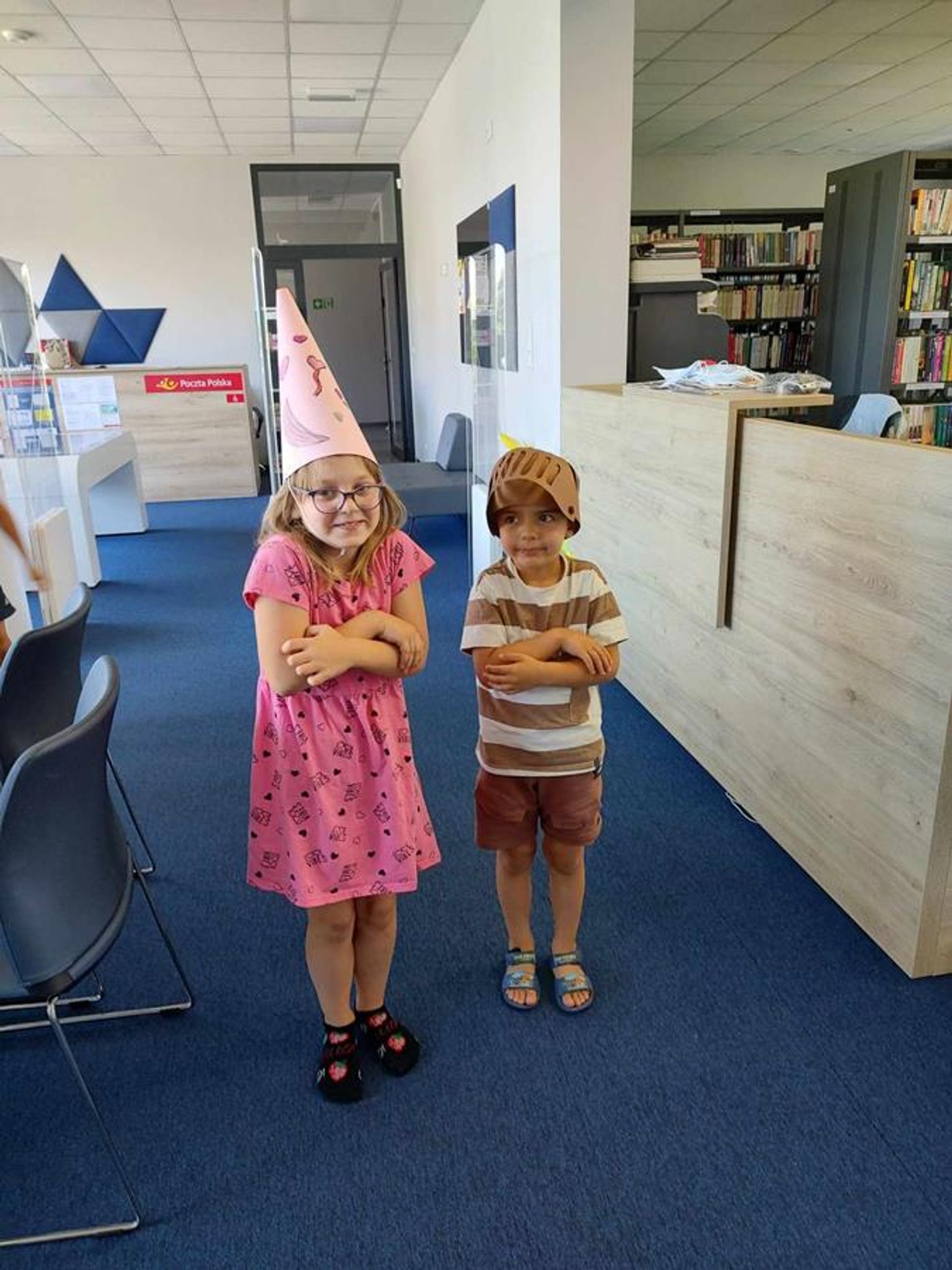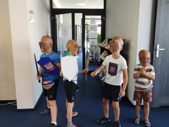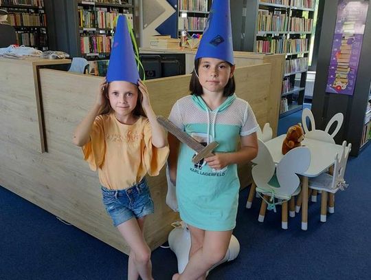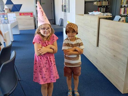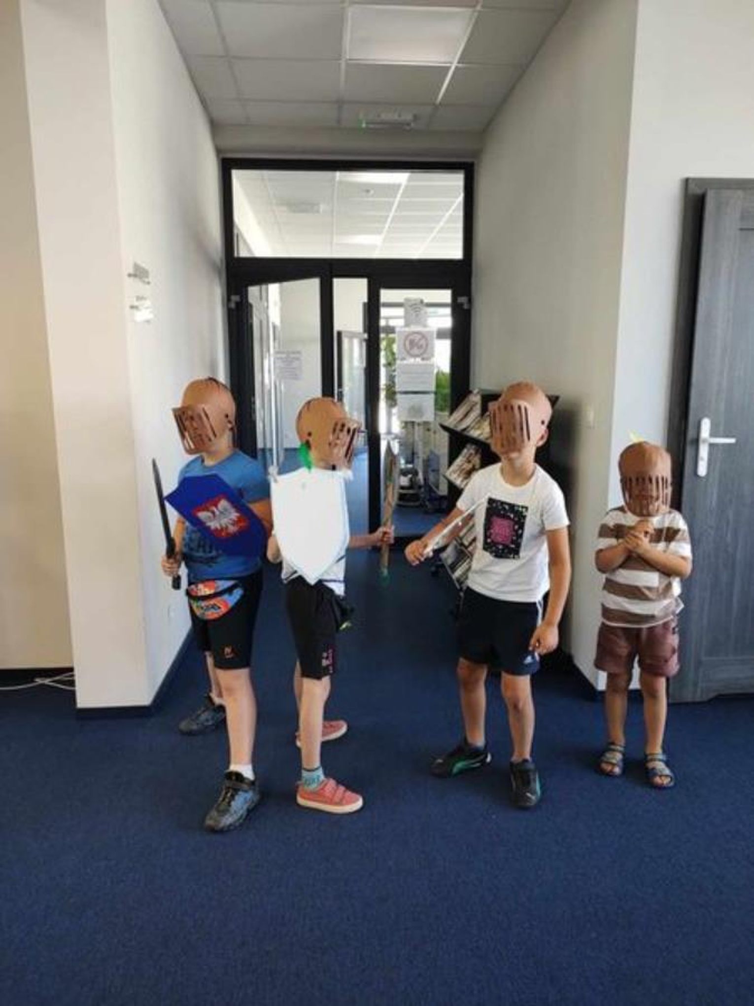 Dzień później w bibliotece odbyły się kolejne zajęcia z cyklu " Wakacje z książką". Tym razem temat to "Rycerze na podstawie książek: "Królowie i Rycerze" i A. Nadolskiego ,,Broń i strój rycerstwa polskiego w średniowieczu. Uczestnicy poznaliśmy Kodeks Rycerski, wykonywali hełmy rycerskie, miecze, tarcze oraz nakrycie głowy dla księżniczek z Domaniowa (zobaczcie zdjęcia niżej).