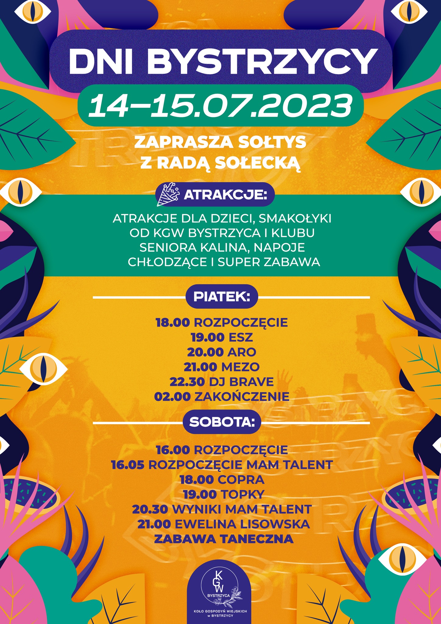Tradycyjnie już nie zabraknie też atrakcji dodatkowych, które będą się odbywały poza sceną. Wśród nich: pokaz straży pożarnej, zabawy dla dzieci z animatorem, dmuchańce, piłkarzyki, bokser, strefa vr. Nie zabraknie też smakołyków przygotowanych przez Koło Gospodyń Wiejskich w Bystrzycy i Klub Seniora "Kalina", a także innych festynowych przysmaków.