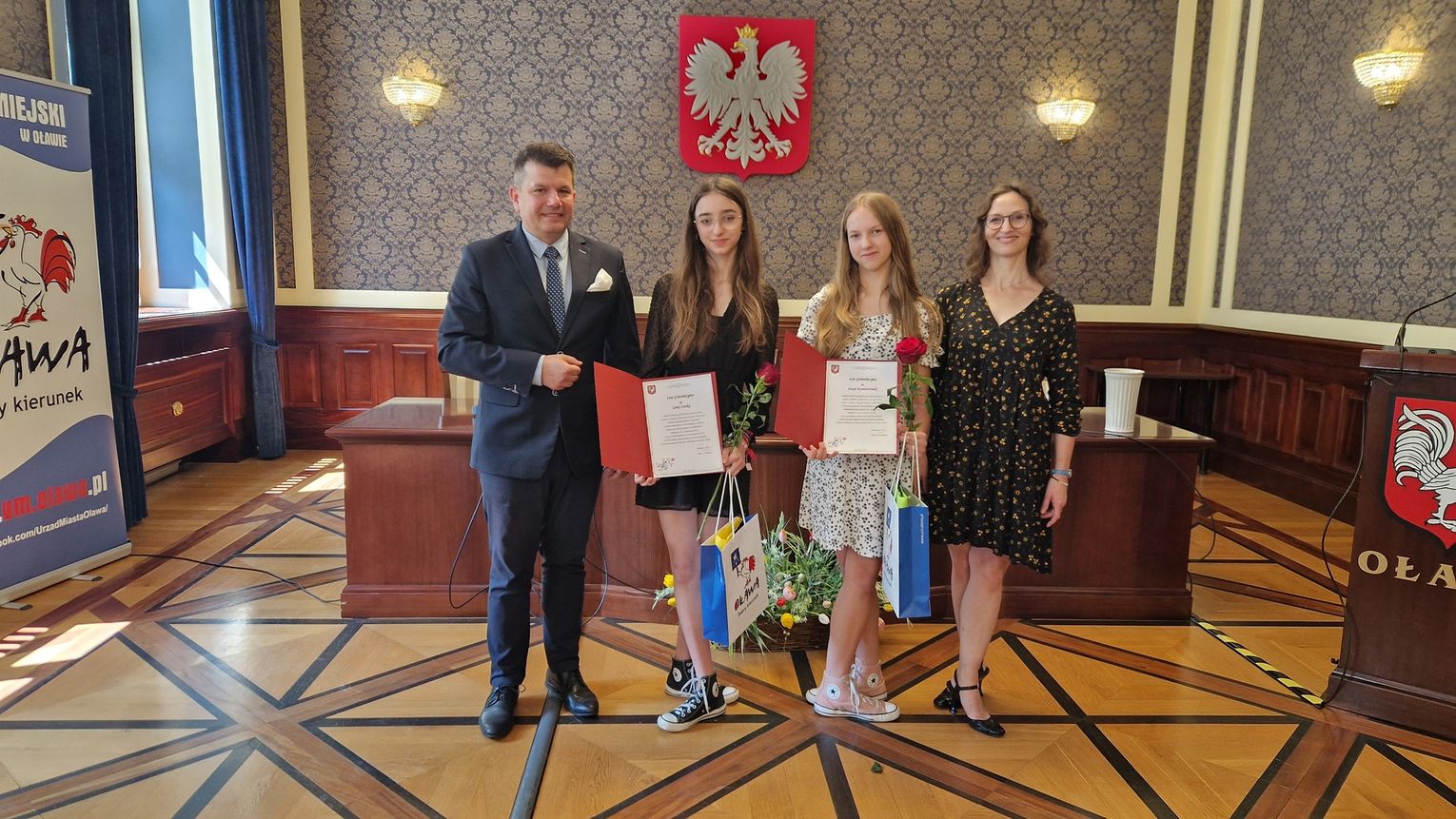 Burmistrz Tomasz Frischmann dziś pogratulował młodym artystkom bardzo dobrego wyniku, przekazał upominki oraz nagrodę finansową. Gratulacje oraz podziękowania za przygotowanie dziewcząt złożył również Annie Staszewskiej właścicielce i jednocześnie nauczycielce Studia Tańca Piruet.