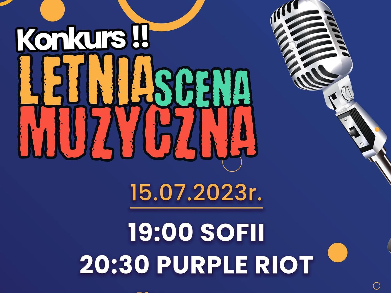 20.30 PURPLE RIOT - zespół powstał we wrześniu 2021 roku we Wrocławiu. Grają muzykę z pogranicza rocka alternatywnego i punku. Do największych inspiracji zaliczają się zespoły takie jak Depeche Mode, Green Day, Rush, Foo Fighters i Muse. Aktualnie skupiają się nad szlifowaniem własnego materiału na próbach i przymierzają się do nagrania dema. Skład zespołu: Eryk Stróżyk – wokal/gitara, Piotr Bocian – gitara, Grzegorz Kuryłowicz - gitara basowa Kornel Stocki – perkusja