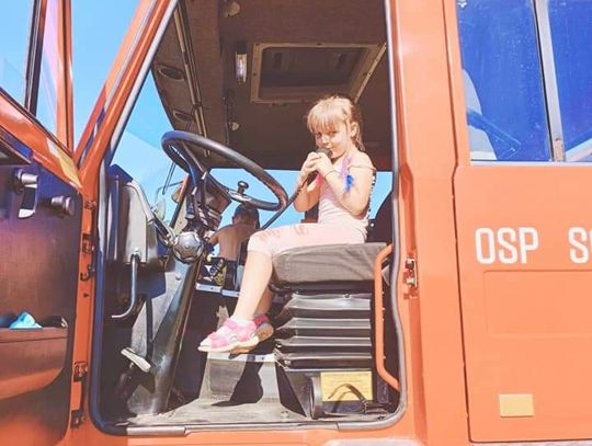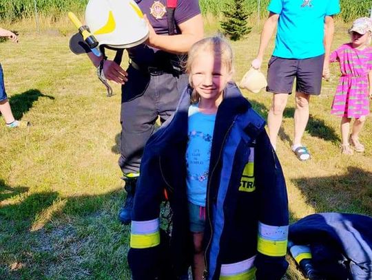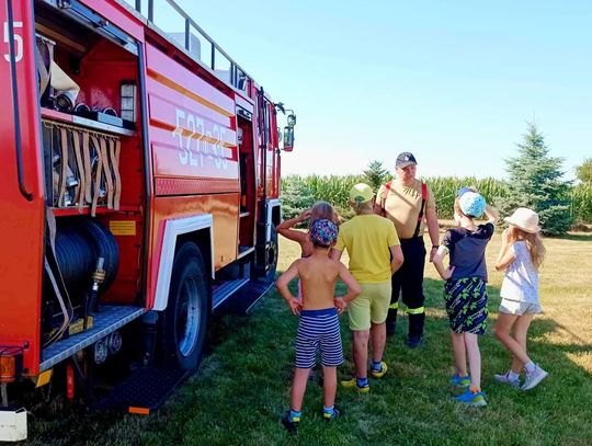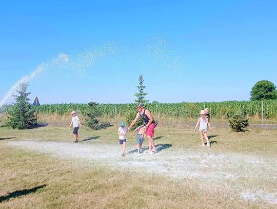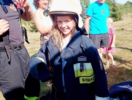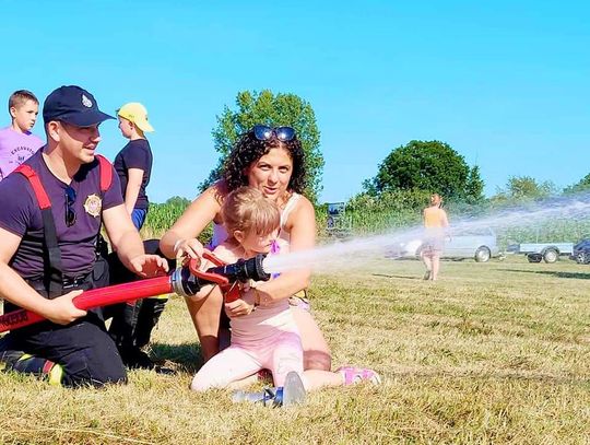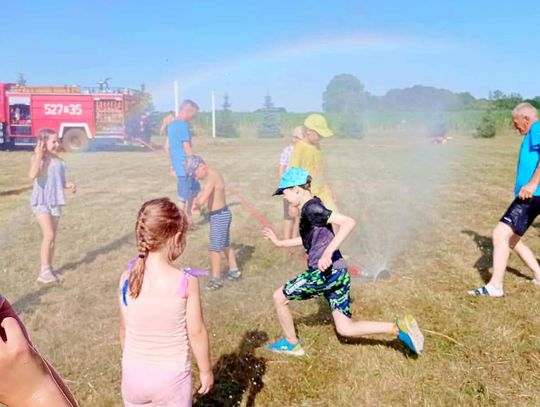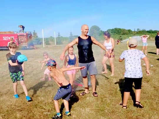 Uczestników odwiedzili także druhowie z OSP Sobocisko, którzy pokazali dzieciom wóz strażacki i jego wyposażenie oraz strój strażaka, który najmłodsi chętnie przymierzali. Następnie dzieci miały możliwość spróbowania swoich sił w przewracaniu pachołków strumieniem wody. Kolejnymi atrakcjami przygotowanymi przez OSP Sobocisko było duuużo piany strażackiej oraz kurtyna wodna, dzięki której wszyscy mieszkańcy mogli się ochłodzić w ten upalny dzień.