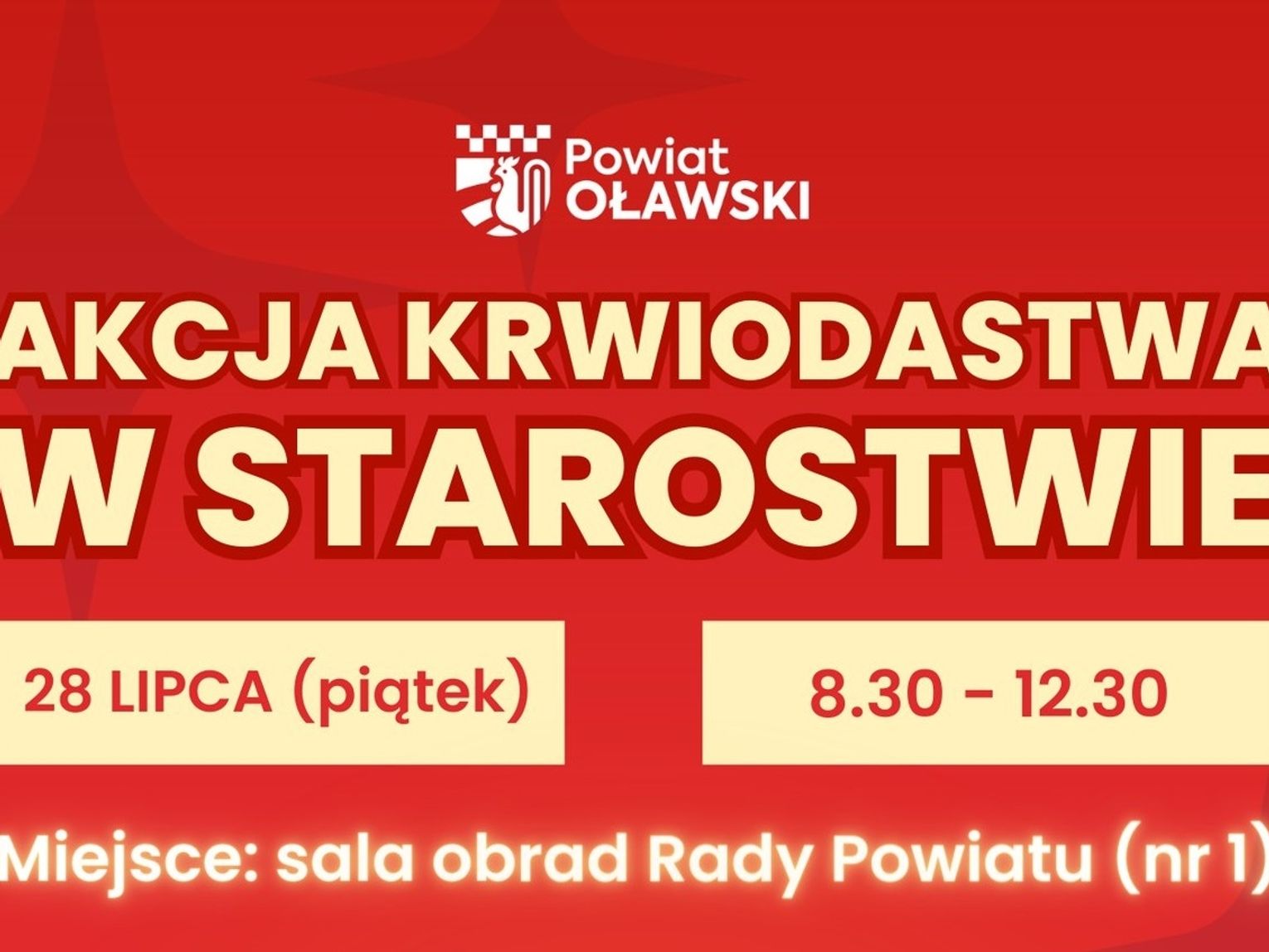 Już 28 lipca (piątek), w godzinach 8.30-12.30, zapraszamy do starostwa na kolejną akcję krwiodawstwa. Sprawmy prezent sobie oraz innym i oddajmy krew, dzięki której możemy ocalić życie choremu dziecku, ofierze wypadku lub pacjentowi na stole operacyjnym. Sala obrad Rady Powiatu w Oławie (sala nr 1)
