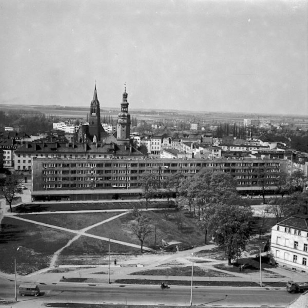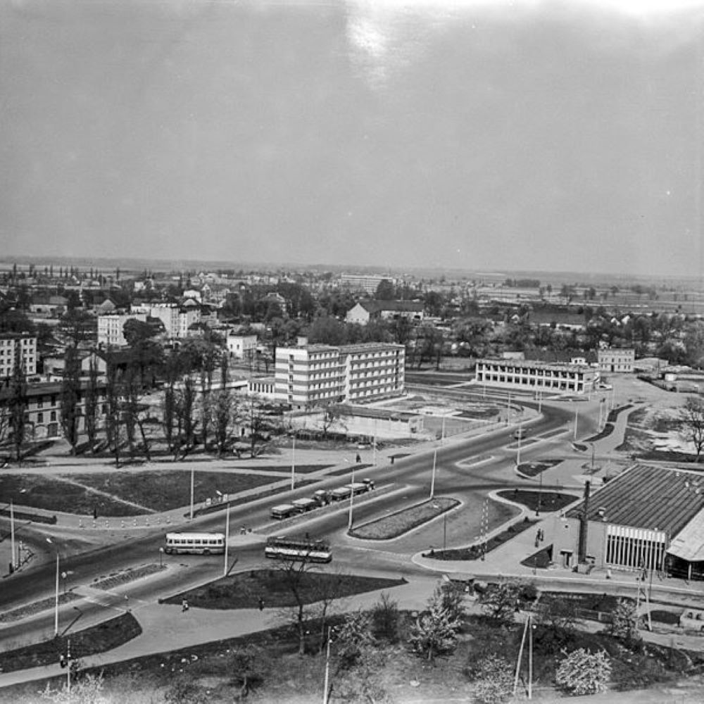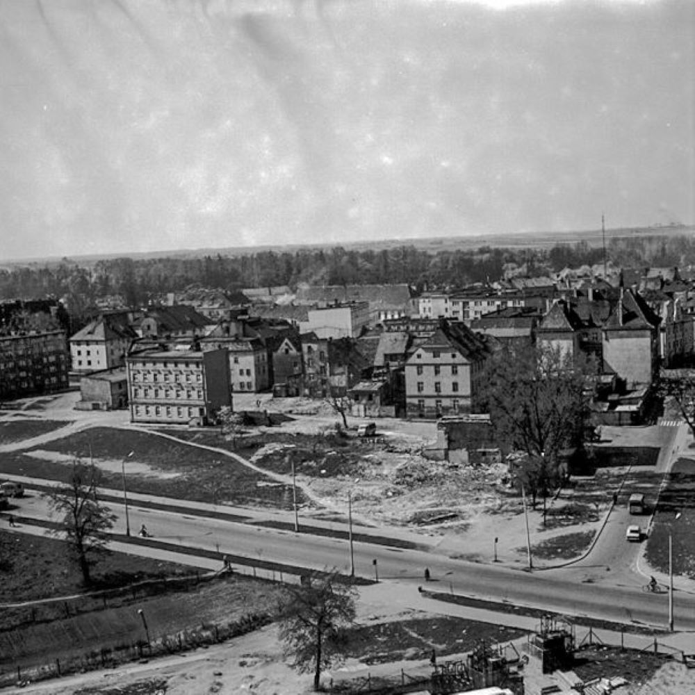 To zdjęcie zrobiłem w 1975 z wieżowca koło PKS - widzimy na nim wieżę ratusza i kościoła MBP. Na pierwszym planie jest plac - wtedy Jedności Narodowej, dziś Józefa Piłsudskiego. Nie ma jeszcze Pomnika Losów Ojczyzny, który został poświęcony w 1992 roku.