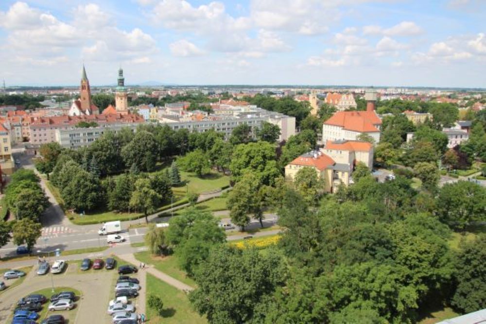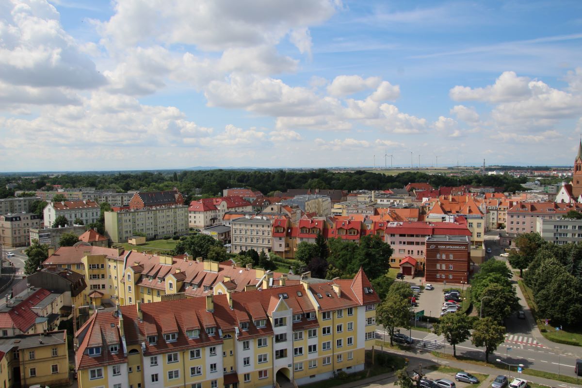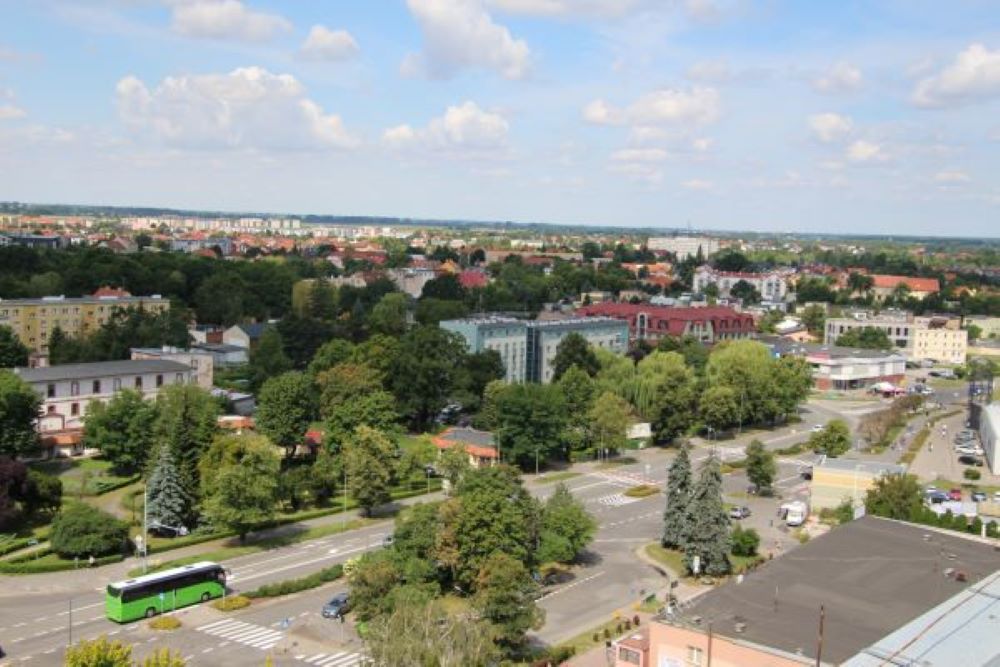 Zdjęcie zrobiłem w 2023 również z dachu wieżowca koło Dworca PKS. Na zdjęciu widzimy nowy dom mieszkalny przy ul. Pałacowej, w którym mieści się Bank Spółdzielczy. Przy ulicy widzimy dawny budynek mieszkalny, w którym obecnie również jest Bank Spółdzielczy. Na dole zdjęcia jest nowy budynek mieszkalny przy ulicy 3 Maja i Piotra Własta. Widzimy również kilkadziesiąt drzew, których nie ma na zdjęciu nr 1.
