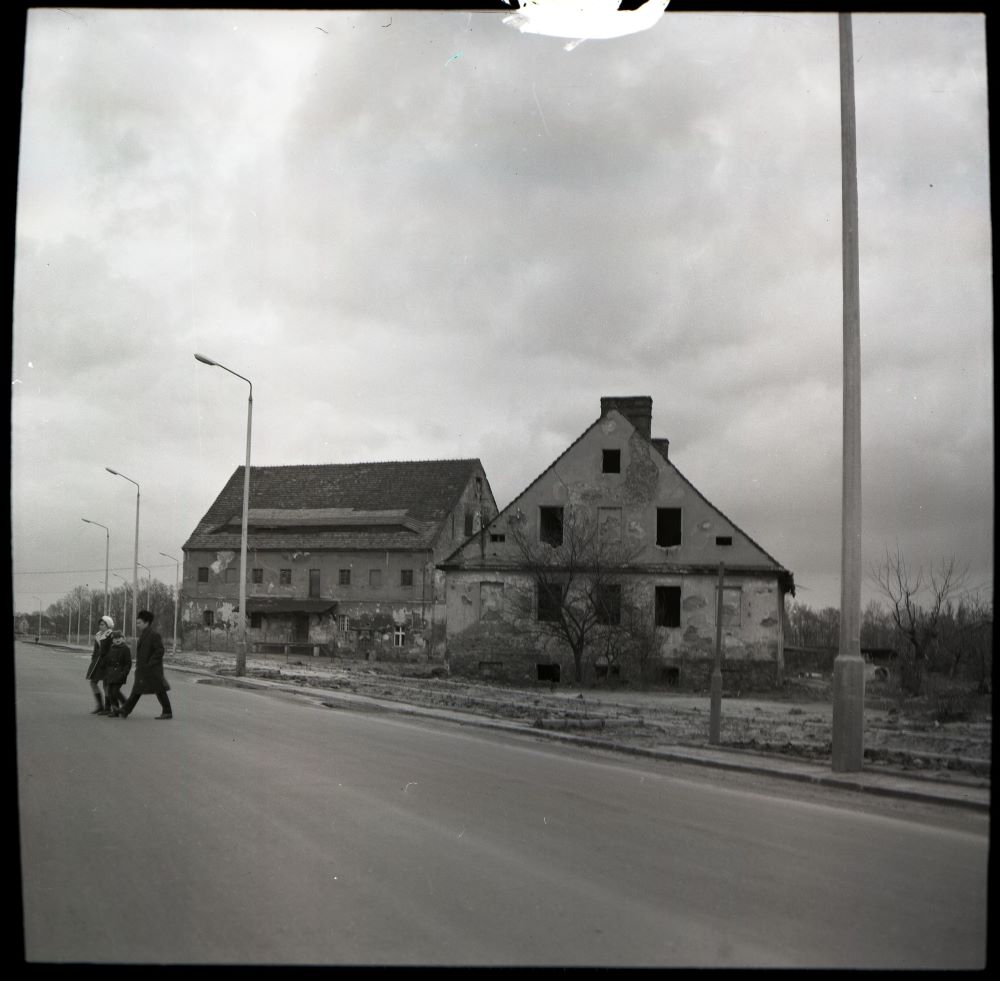 To zdjęcie zrobiłem w 1975 z wieżowca koło PKS. Widzimy po prawej nowo wybudowany Dworzec PKS i wyjazd z dworca PKS dla autobusów na ulicę 3 Maja. Po lewej za drzewami widać budynek, w którym był magazyn spożywczy i potem Tani Sklep PSS. Na środku widzimy budynek, w którym wtedy był Hotel Robotniczy dla pracowników Firmy budowlanej „Północ”, budującej osiedla mieszkaniowe w Oławie. Dziś w tym budynku mieści się Starostwo Powiatowe. Po prawej widzimy w budowie budynek, w którym będzie Dom Handlowy „Junior”. Wtedy praktycznie nie było w tym rejonie drzew, chociaż bardziej w prawo (na zdjęciu nie widać ) na stadionie rosły piękne stare dęby, a na ulicy Sportowej Akacje.