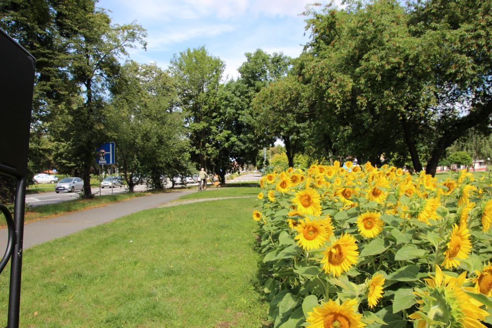 Zdjęcie nr 8 zrobiłem 2023 - po lewej za drzewami jest ulica 3 Maja, w miejscu, gdzie są słoneczniki, stały budynki ze zdjęcia wcześniejszego, a w głębi po prawej za drzewami jest dworzec autobusowy PKS.