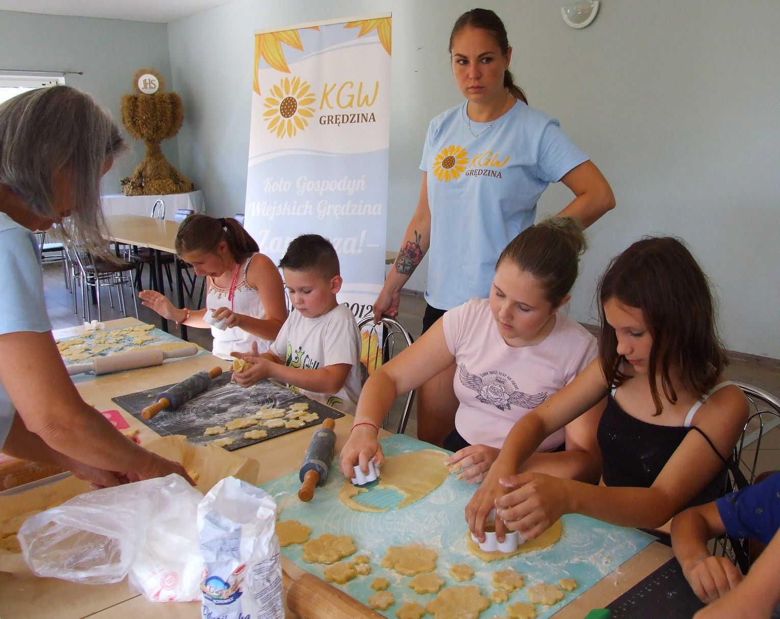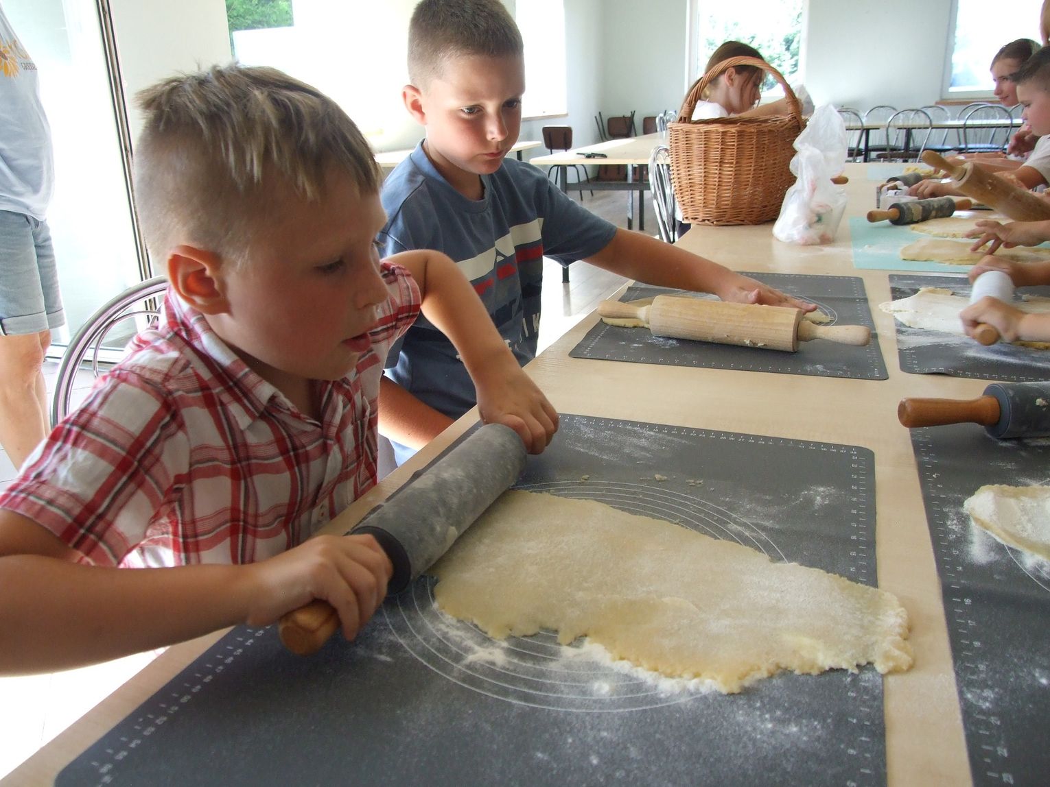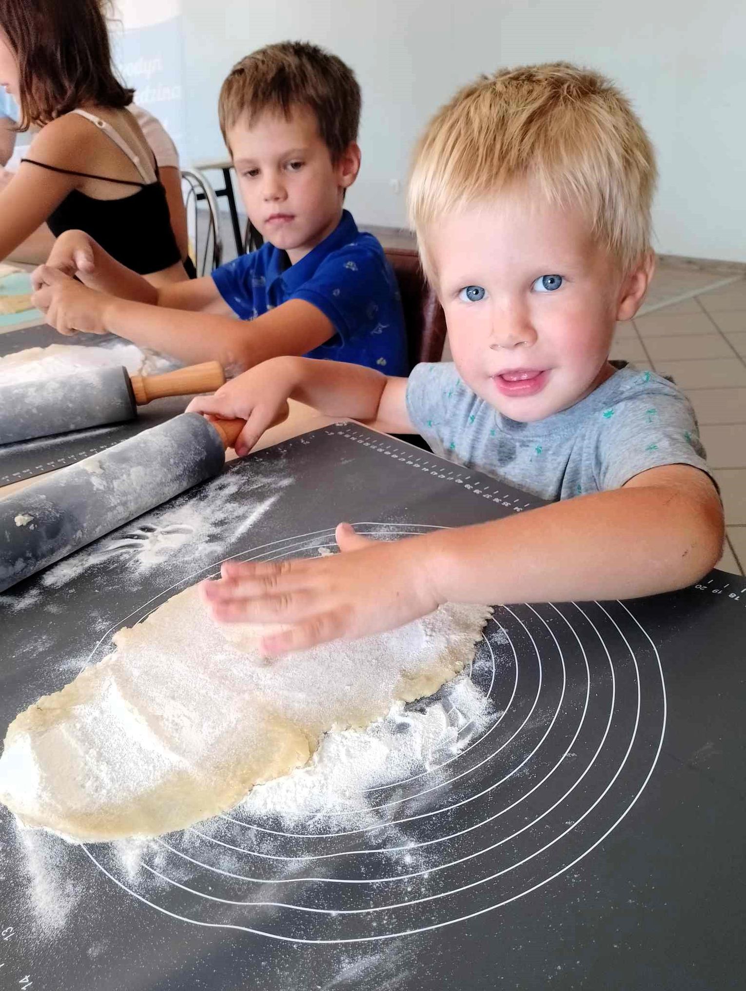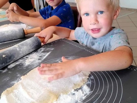 Uczestnicy rozpoczęli pracę od mozolnego wałkowania przygotowanego wcześniej ciasta półkruchego. Były kłopoty, bo placki kleiły się do podłoża, ale dzięki pomocy animatorek i mąki dało się temu zaradzić. Wyciskanie ciasteczek foremkami to już była czysta przyjemność! Jeden z uczestników wydarzenia, Sebastian, bardzo kreatywnie podszedł do wyzwania i uformował fantazyjne serduszko! Przy pracy można było zaobserwować na twarzach dzieci ogromne skupienie, wysiłek, chęć podołania wyzwaniu. Gdy serduszka, kwiatuszki, pizze i gwiazdki piekły się w piekarniku a wałki i stolnice przygotowywane były do drugiej części warsztatów, uczestnicy oddali się rozrywce na pobliskim placu zabaw. Następne zadanie polegało na ozdobieniu wykonanych przez dzieci ciasteczek oraz upieczonych przez jedną z członkiń koła piernikowych serduszek lukrem i płatkami jadalnych kwiatów polnych. Oj, się działo! Królowała duma z własnoręcznie przygotowanych wypieków! Młodzi cukiernicy puścili wodze fantazji i z zapałem przystąpili do dzieła! Nie było dwóch jednakowych egzemplarzy! Zresztą, trudno to było stwierdzić, gdyż część gotowych smakołyków od razu została skonsumowana! Było oblizywanie paluszków i buzie umorusane lukrem! Znaczy, smakowało! Serdeczne gratulacje dla wszystkich milusińskich! O tym, że warsztaty były potrzebne i zakończone sukcesem świadczyły pytania dzieci „kiedy będą następne?”! Możemy zapewnić, że niebawem.