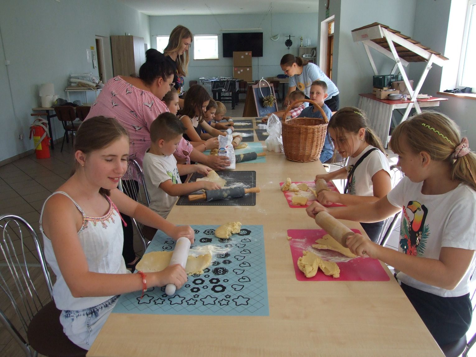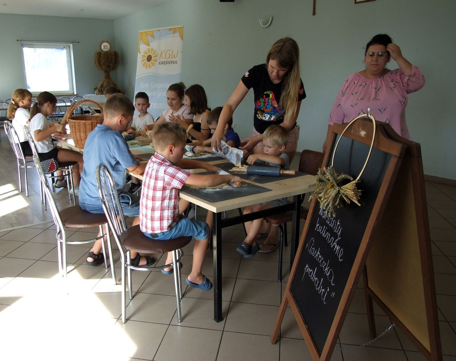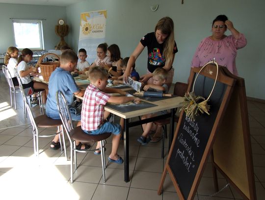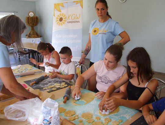Uczestnicy rozpoczęli pracę od mozolnego wałkowania przygotowanego wcześniej ciasta półkruchego. Były kłopoty, bo placki kleiły się do podłoża, ale dzięki pomocy animatorek i mąki dało się temu zaradzić. Wyciskanie ciasteczek foremkami to już była czysta przyjemność! Jeden z uczestników wydarzenia, Sebastian, bardzo kreatywnie podszedł do wyzwania i uformował fantazyjne serduszko! Przy pracy można było zaobserwować na twarzach dzieci ogromne skupienie, wysiłek, chęć podołania wyzwaniu. Gdy serduszka, kwiatuszki, pizze i gwiazdki piekły się w piekarniku a wałki i stolnice przygotowywane były do drugiej części warsztatów, uczestnicy oddali się rozrywce na pobliskim placu zabaw. Następne zadanie polegało na ozdobieniu wykonanych przez dzieci ciasteczek oraz upieczonych przez jedną z członkiń koła piernikowych serduszek lukrem i płatkami jadalnych kwiatów polnych. Oj, się działo! Królowała duma z własnoręcznie przygotowanych wypieków! Młodzi cukiernicy puścili wodze fantazji i z zapałem przystąpili do dzieła! Nie było dwóch jednakowych egzemplarzy! Zresztą, trudno to było stwierdzić, gdyż część gotowych smakołyków od razu została skonsumowana! Było oblizywanie paluszków i buzie umorusane lukrem! Znaczy, smakowało! Serdeczne gratulacje dla wszystkich milusińskich! O tym, że warsztaty były potrzebne i zakończone sukcesem świadczyły pytania dzieci „kiedy będą następne?”! Możemy zapewnić, że niebawem.