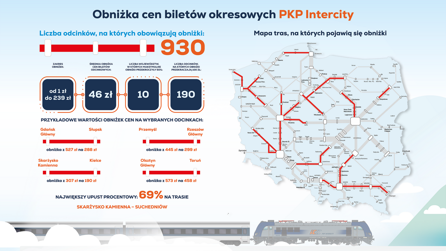 Na 190 odcinkach PKP Intercity skala obniżki biletów waha się między 100 a 239 zł, a w przypadku 206 odcinków upusty wyniosą między 50-99 zł. Na największą kwotową obniżkę będą mogli liczyć pasażerowie podróżujący na trasie Słupsk – Trójmiasto. Zapłacą oni za bilet miesięczny aż o 239 zł mniej. Jednak wysokie upusty wprowadzono także na trasach: Rzeszów Główny - Przemyśl, gdzie cena biletu spadła o 146 zł, Skarżysko Kamienna - Kielce, ze zniżką na poziomie 117 zł, czy Olsztyn Główny – Toruń, z upustem rzędu 115 zł.