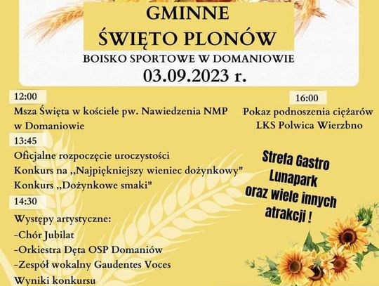 Oczywiście nie zbraknie bardziej tradycyjnych wydarzeń dożynkowych. Rozpocznie się o godz.12.00 mszą świętą w miejscowym kościele, potem rozstrzygnięcie konkursów na najpiękniejszy gminny wieniec dożynkowy i "dożynkowe smaki". O 14.30 rozpoczną się występy artystyczne, m.in. na scenie zobaczymy chór "Jubilat" i Orkiestrę Dętą OSP Domaniów.