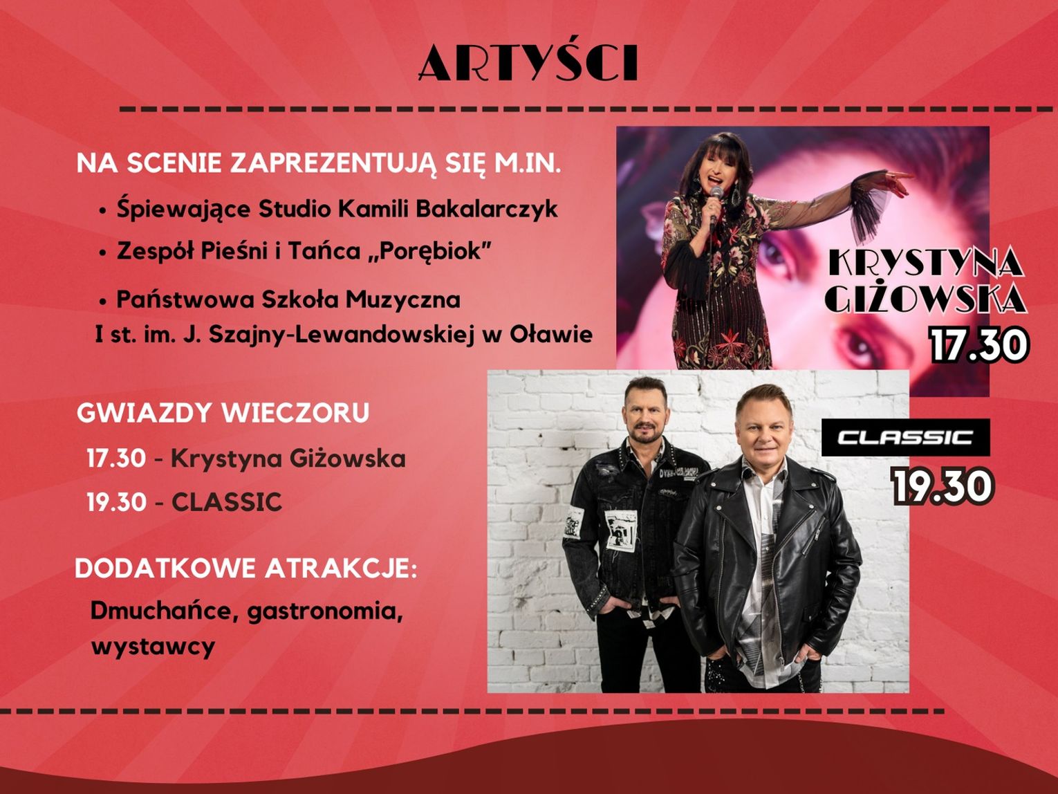 Na urodzinach Powiatu Oławskiego zagrają: zespół CLASSIC, Krystyna Giżowska, Śpiewające Studio Kamili Bakalarczyk, Zespół Pieśni i Tańca "Porębiok", Państwowa Szkoła Muzyczna I st. im. J. Szajny-Lewandowskiej w Oławie.