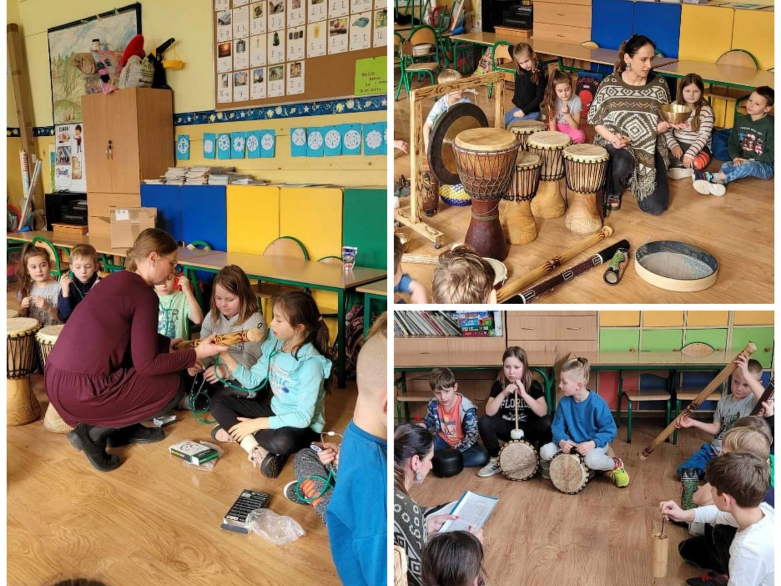 Po co? Aby zaprezentować umiejętność gry na instrumentach etnicznych. Uczniowie przedstawili bajkę muzykoterapeutyczną pt. „Mit o stworzeniu świata”, w trakcie której pięknie zabrzmiały instrumenty etniczne tj. djembe, kalimba, kij deszczowy, dzwoneczki koshi, bęben oceaniczny, misy tybetańskie, burzownica, tank drum, gong. W zajęciach brała udział kl. I A pod opieką p. Beaty Elber. Wszystkie dzieci aktywnie uczestniczyły w zajęciach. Prezentacja umiejętności gry na instrumentach etnicznych nie tylko integruje społeczność szkolną, ale także rozwija wrażliwość kulturową uczniów i promuje różnorodność.
