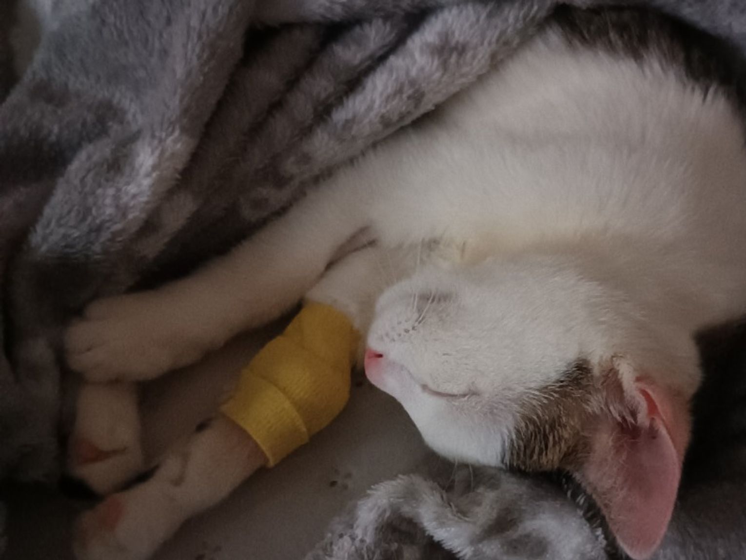 Miesiąc temu zaczęło się najgorsze. Kot nagle przestał jeść i miał problemy z chodzeniem (tylne łapki ciągnął), gdy wcześniejsze 7 miesięcy u nas była zdrowym, radosnym, bawiącym się kotkiem. Po obszernych badaniach weterynarza nie wiemy, co kotu jest. Mimo podawania silnych przeciwbólowych, antybiotyku o szerokim spektrum i podawania kroplówek, sytuacja kota się nie poprawiła.
