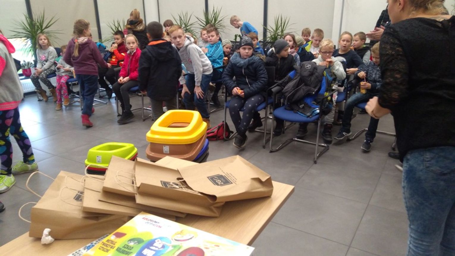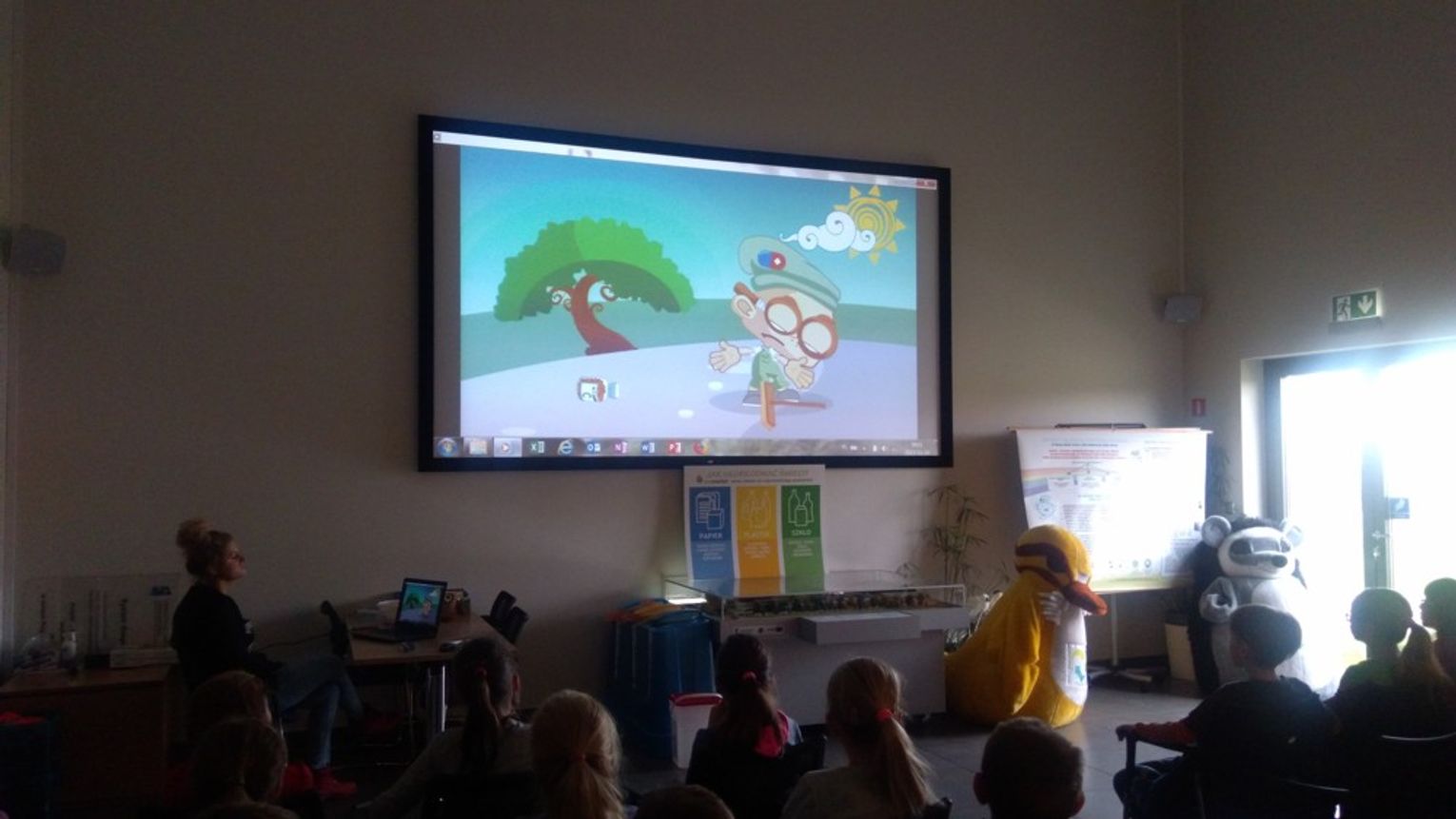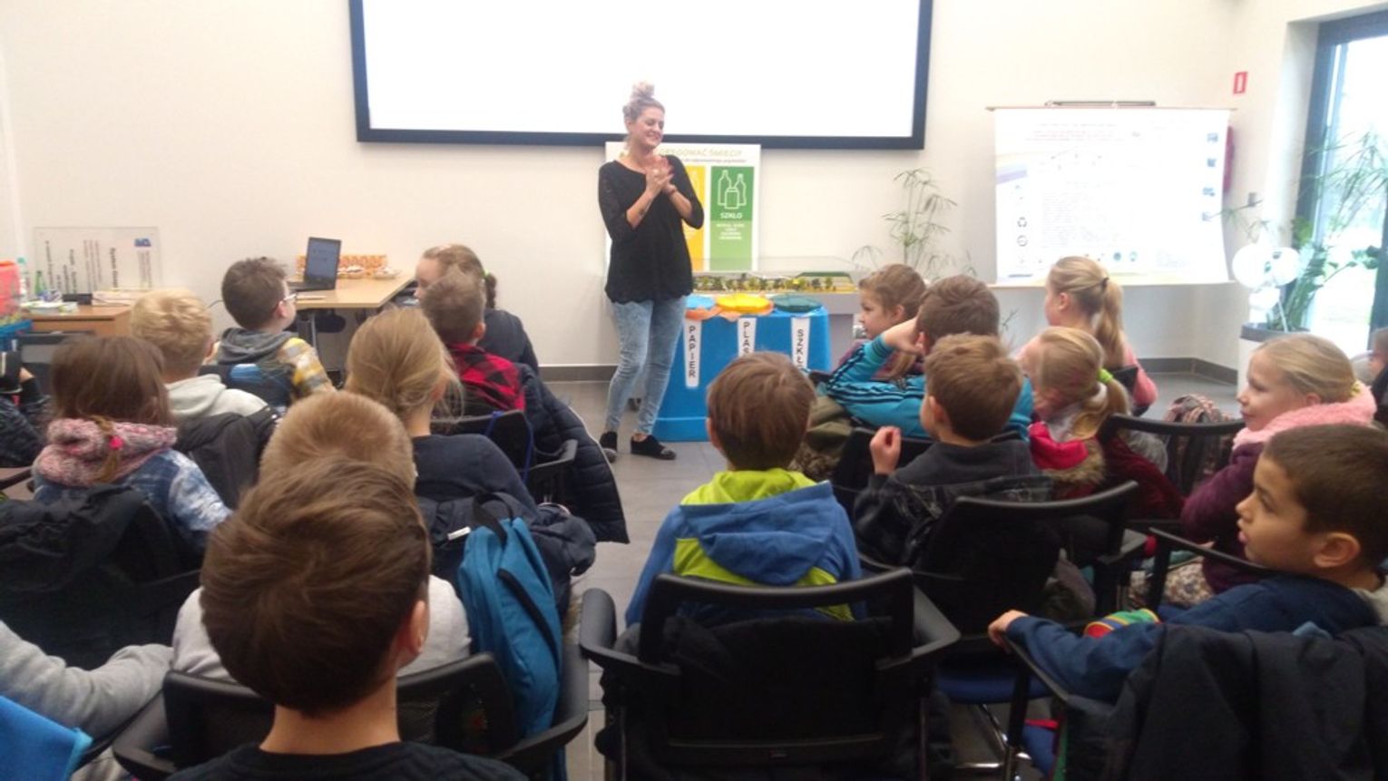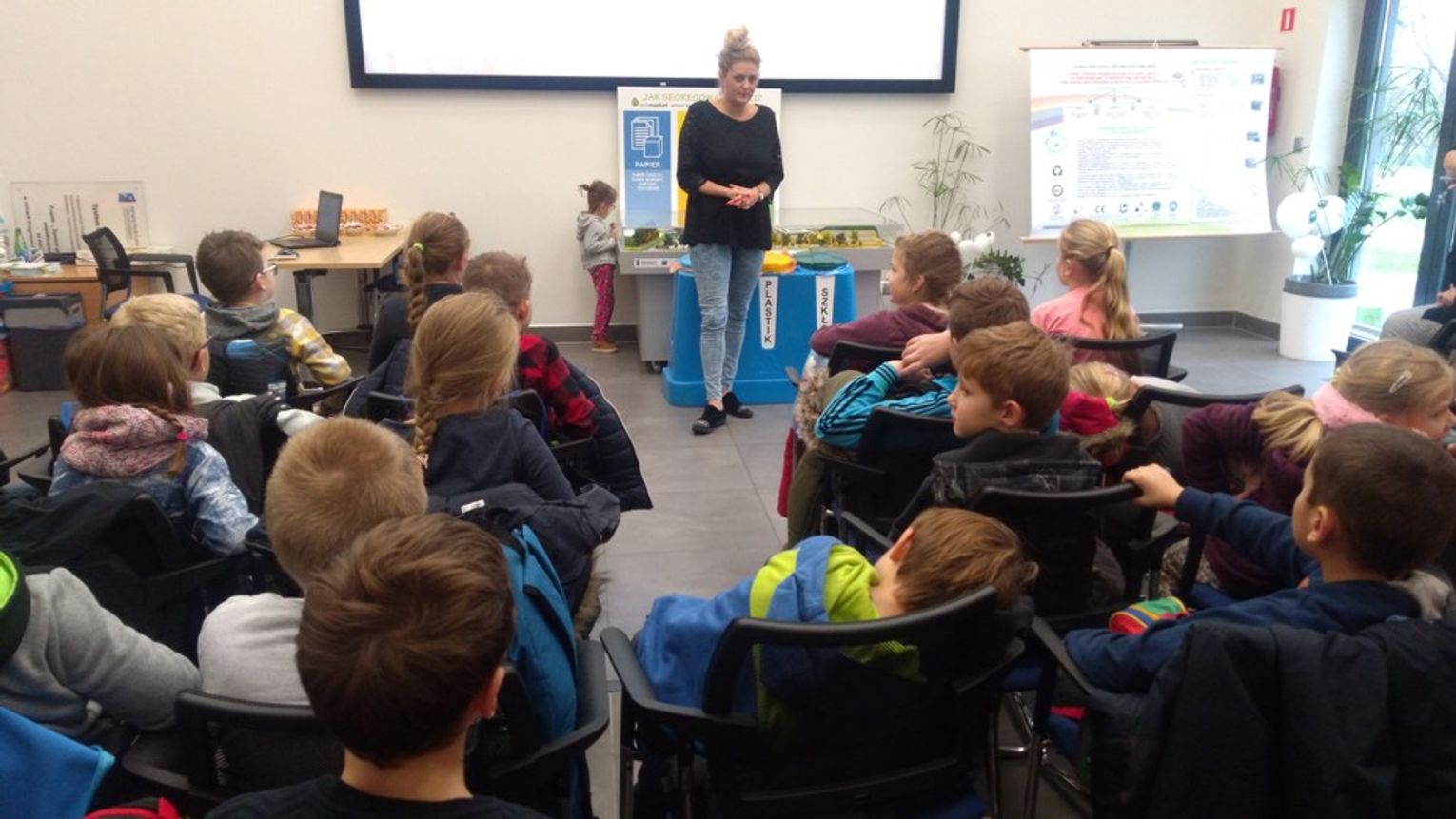 Jak zawsze początek zwiedzania zaczął się od wizyty w Sali edukacyjnej mieszczącej się w budynku administracyjnym gdzie Pani Karolina Korycka, aby zainteresować dzieci tematyką śmieciową wyświetliła im filmiki dotyczące losów poszczególnych rodzajów odpadów: „Drugie życie odpadów” ,„Eko Janek – Lekarstwa”, „Eko Janek o segregowaniu bioodpadów” oraz „Eko Janek o segregacji papieru.”