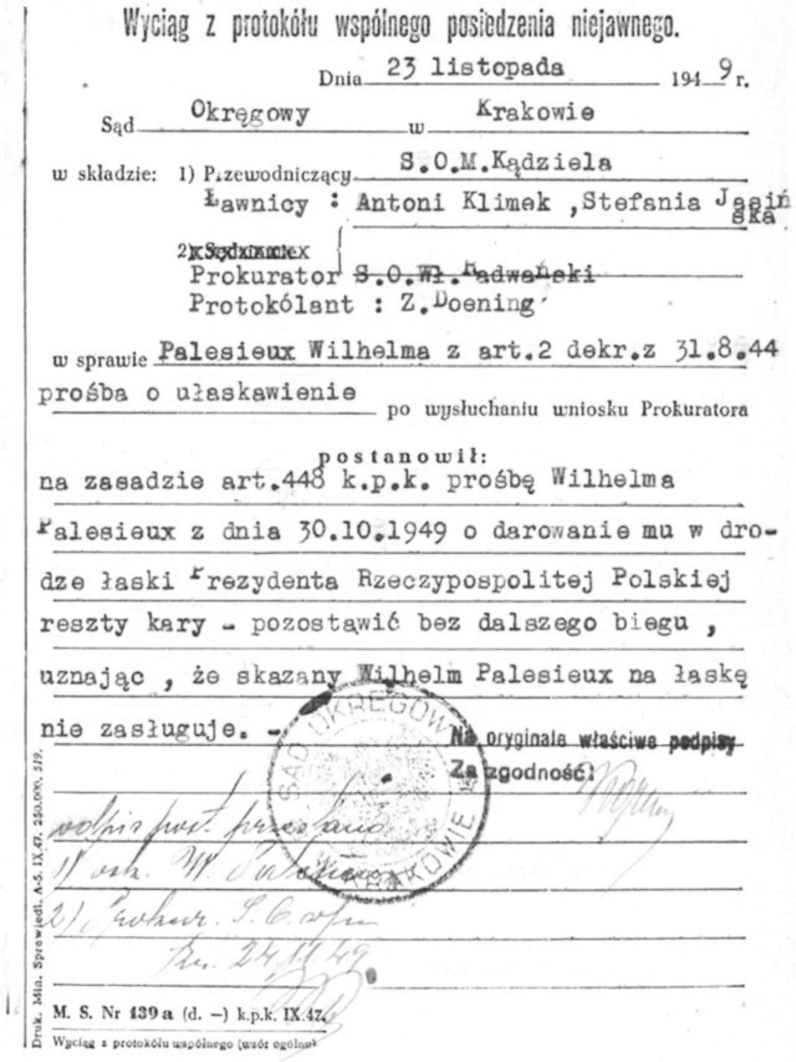 Prokuraturze nie udało się jednak wtedy dowieść, że brał udział w kradzieży zaginionego obrazu Rafaela. Palezieux 30 października 1949 r. złożył prośbę o darowanie mu reszty kary w drodze łaski Prezydenta RP (był nim wtedy niejaki B. Bierut). Jak wynika z protokołu wspólnego posiedzenia niejawnego (z 23 listopada 1949 roku) Sądu Okręgowego w Krakowie, skład orzekający uznał, że sprawę należy, cyt. "pozostawić bez dalszego biegu, uznając, że skazany Wilhelm Palesieux na łaskę nie zasługuje".