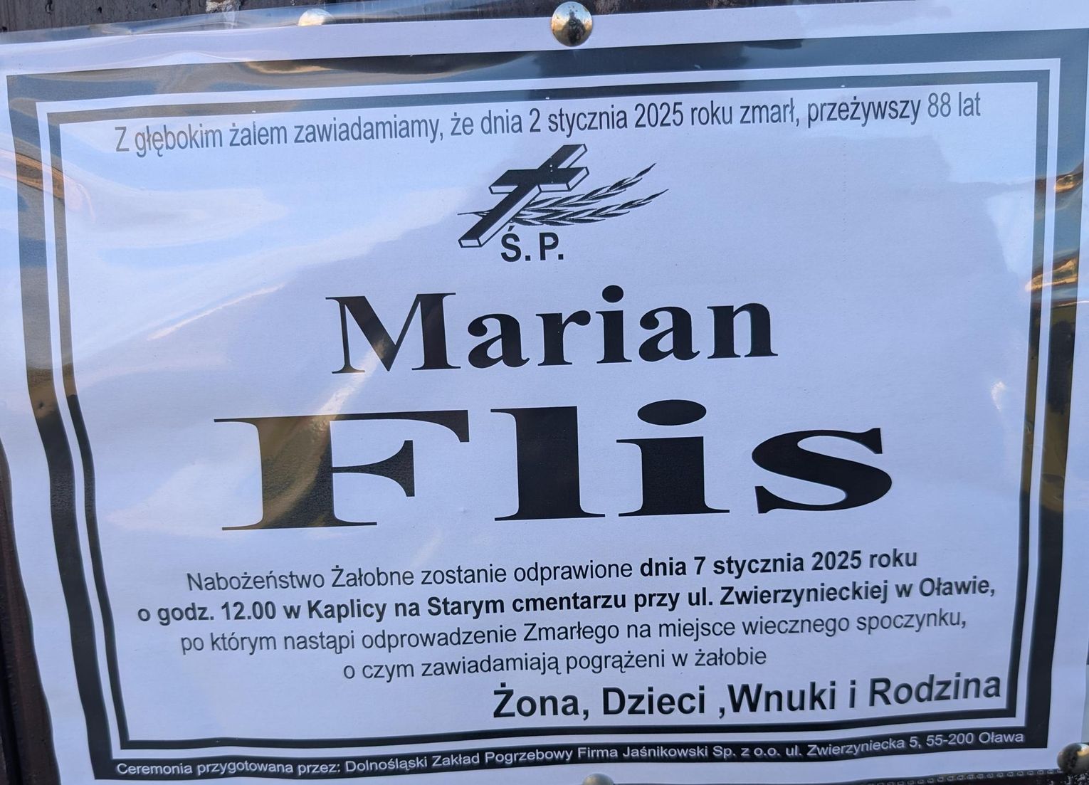 Nabożeństwo żałobne zostanie odprawione 7 stycznia 2025 roku o godz.12.00 w kaplicy na tzw. starym cmentarzu przy ul. Zwierzynieckiej w Oławie, po czym nastąpi odprowadzenie zmarłego na miejsce wiecznego spoczynku, o czym zawiadamiają pogrążeni w żałobie