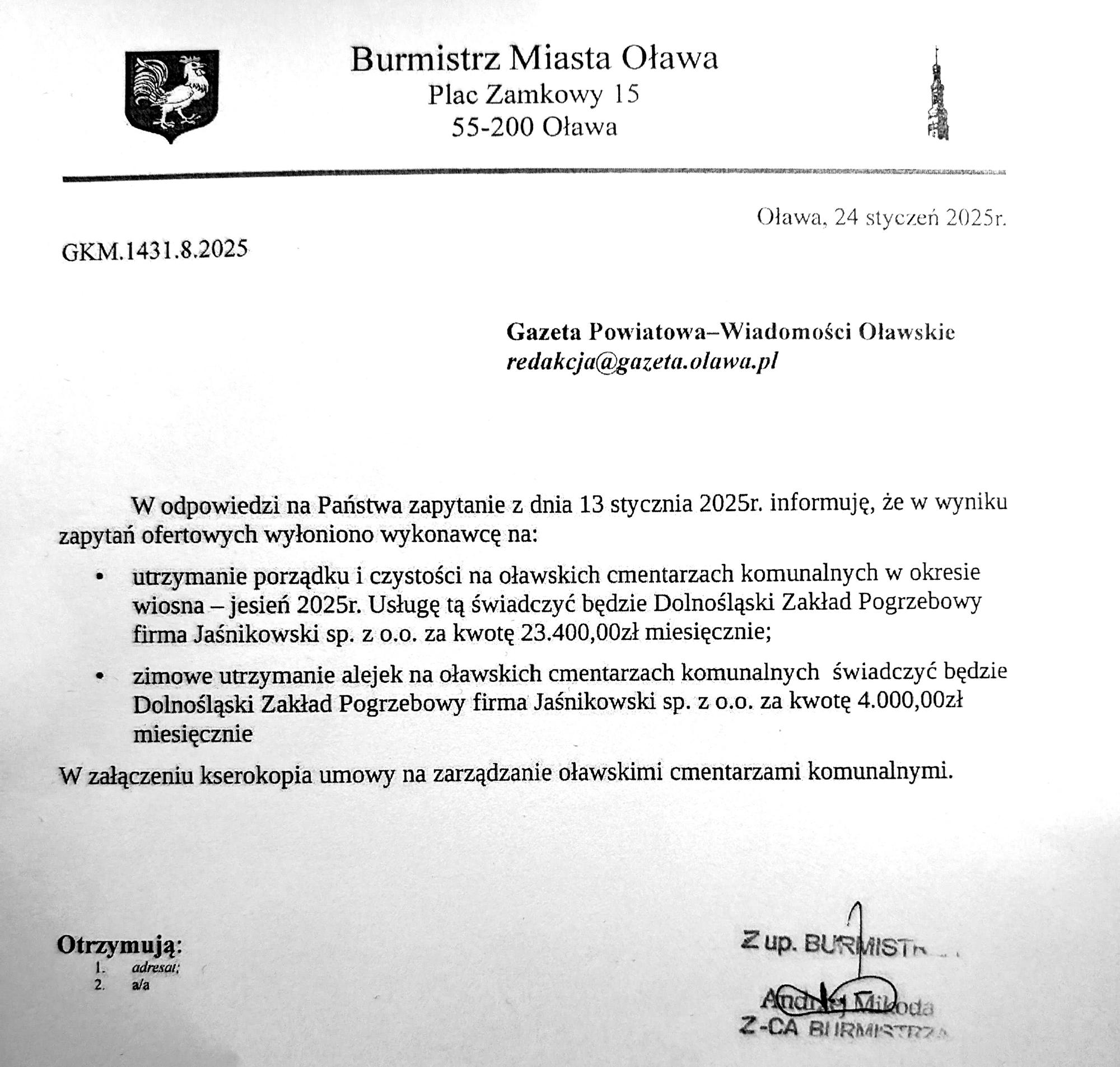 No to je zadałem. 13 stycznia. Sporządzenie odpowiedzi musiało być bardzo pracochłonne, bo odpowiedź dostałem 27 stycznia, czyli dopiero po 14 dniach (wiadomo, udostępnianie informacji publicznej na wniosek następuje bez zbędnej zwłoki, nie później jednak niż w terminie 14 dni od dnia złożenia wniosku - tak mówi prawo). I co się okazuje. Otóż z odpowiedzi, jakiej udzielił mi zastępca burmistrza Andrzej Mikoda, wynika, że te 4 tys. zł to tylko za (cytuję) "zimowe utrzymanie alejek na oławskich cmentarzach komunalnych". A co z porządkiem poza zimą? Otóż miasto podpisało kolejną umowę na "utrzymanie porządku i czystości na oławskich cmentarzach komunalnych w okresie wiosna-jesień 2025r.", a usługę tę świadczyć będzie... - tu werble - Dolnośląski Zakład Pogrzebowy firma Jaśnikowski sp. z o.o. za kwotę 23.400,00zł miesięcznie. O tym jakoś na miejskim Facebooku nie przeczytałem, choć wcześniej zapowiedź tam była taka: Dodatkowe postępowanie ogłoszono na usługi związane z akcją zima i sprzątaniem na cmentarzach (...) miasto prowadzi negocjacje z tymi firmami i wybierze najkorzystniejszą ofertę - o czym poinformujemy!