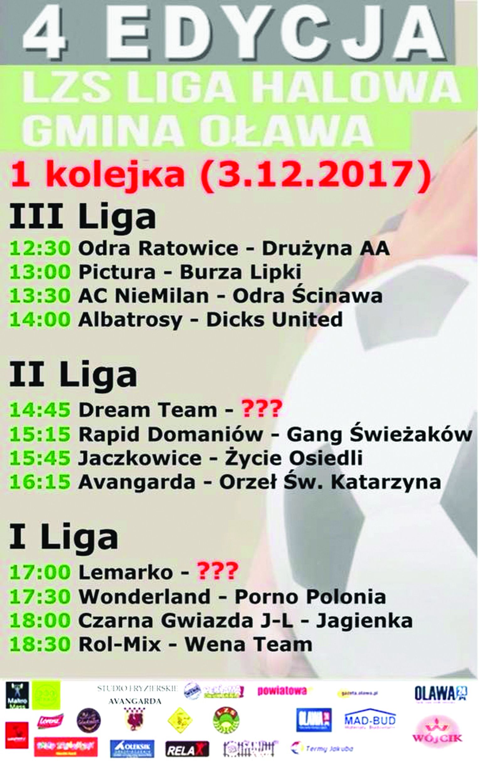 Futsalowe rozgrywki gminne w sezonie 2017/18 rozpoczną się o godzinie 12.30. W pierwszym spotkaniu "Odra" Ratowice zmierzy się z "Drużyną AA". Ostatni mecz w inauguracyjnym dniu zaplanowano na godzinę 18.30. Wtedy wybiegną na parkiet "Wena Team" oraz "Rol-Mix", który w poprzedniej edycji LHPN występował pod nazwą "Bystrzyca".