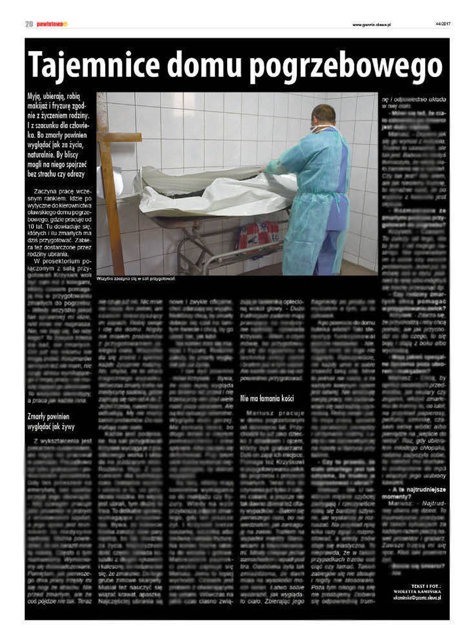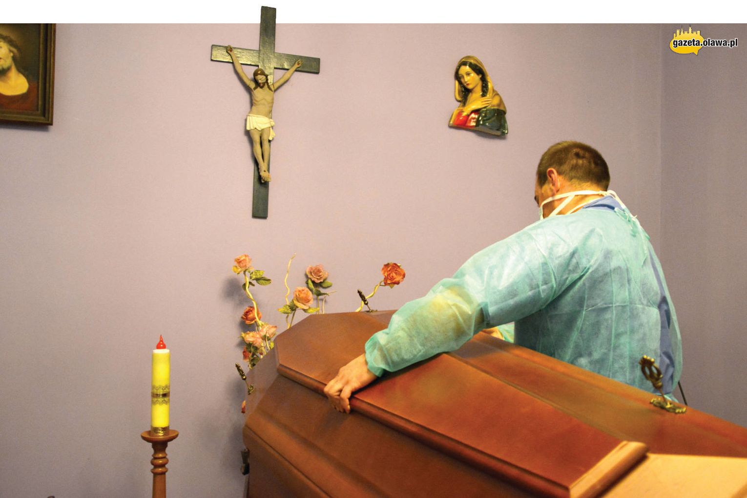 Zaczyna pracę wczesnym rankiem. Idzie po wytyczne do kierownictwa biura oławskiego domu pogrzebowego, gdzie pracuje od 10 lat. Tu dowiaduje się, których i ilu zmarłych ma dziś przygotować. Zabiera też dostarczone przez rodziny ubrania.