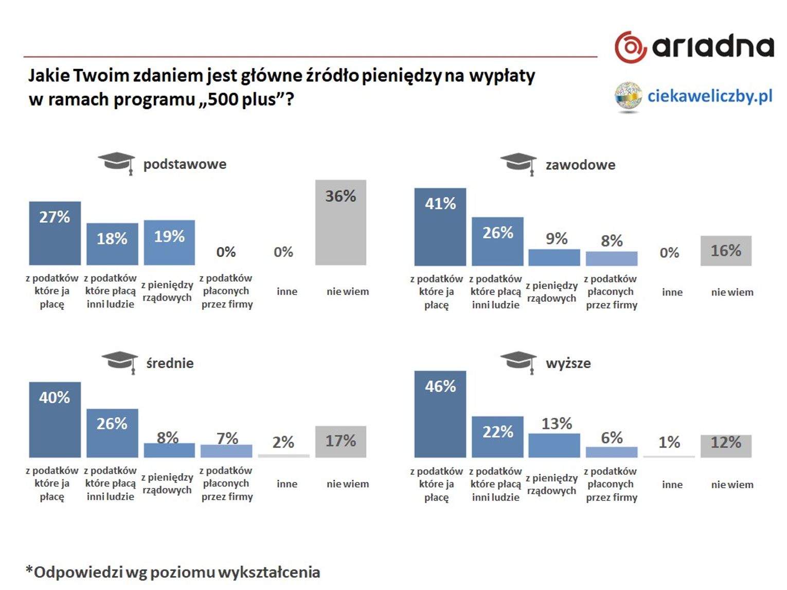 Znajomość źródeł finansowania rządowego programu jest zależna od wykształcenia. Najwięcej osób, które nie wiedzą, skąd rząd ma pieniądze na „500 plus” jest wśród osób z wykształceniem podstawowym (36%), a najmniej – z wyższym (12%).