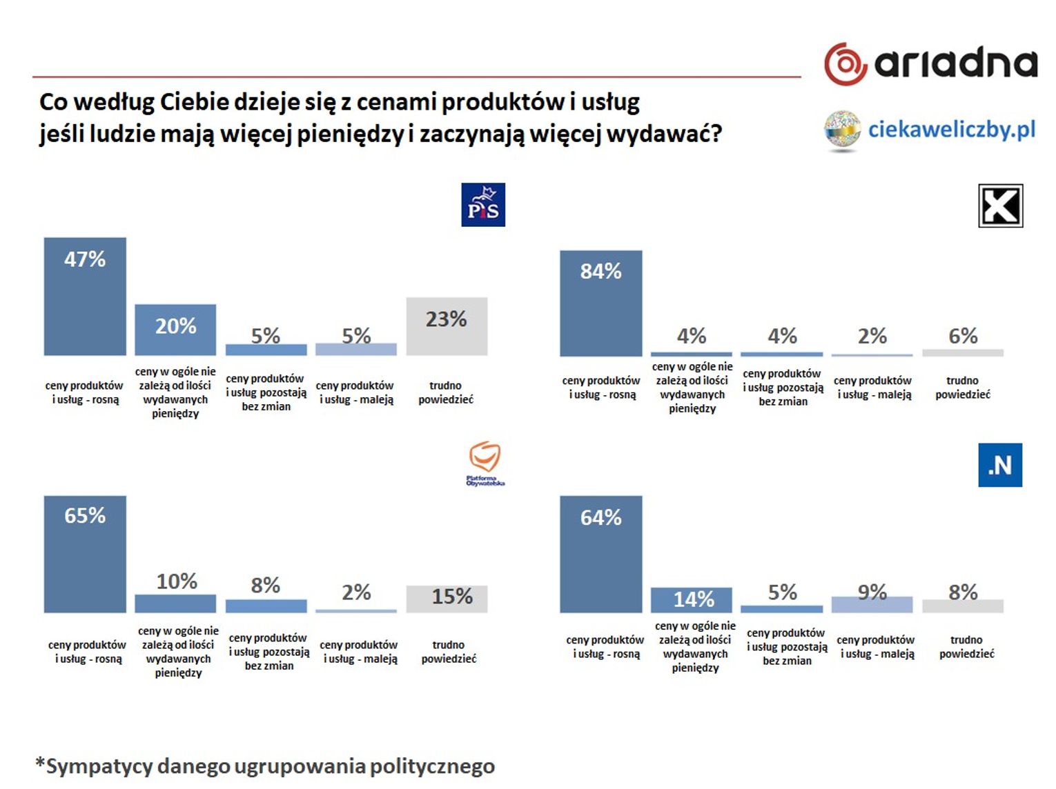 Największy odsetek osób, które uważają, że ceny produktów i usług w ogóle nie zależą od ilości wydawanych pieniędzy jest wśród sympatyków PiS (20%), a najmniejszy – wśród Kukiz’15 (4%)