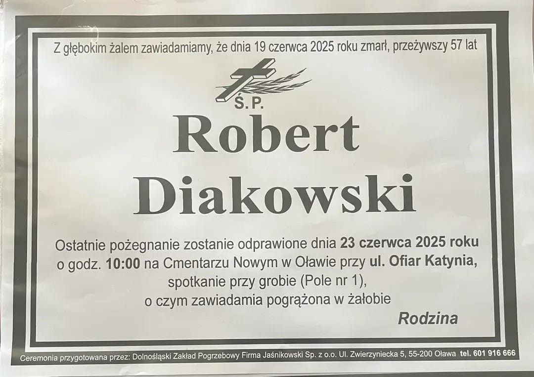 Ostatnie pożegnanie zostanie odprawione 23 czerwca 2025 roku o godz.10.00 na tzw. nowym cmentarzu w Oławie przy ul. Ofiar Katynia - spotkanie przy grobie - pole nr 1 - o czym zawiadamia pogrążona w żałobie RODZINA
