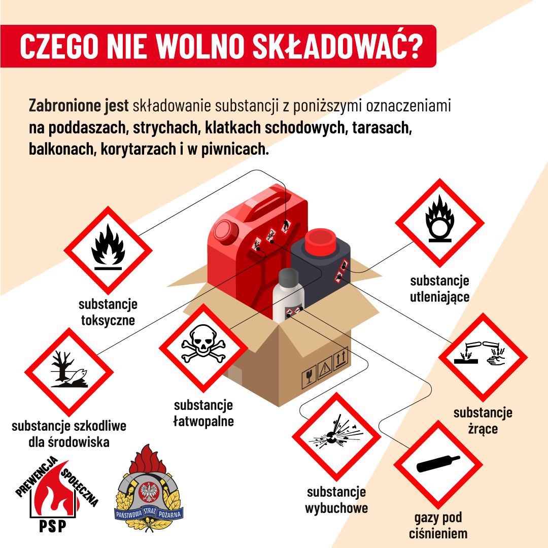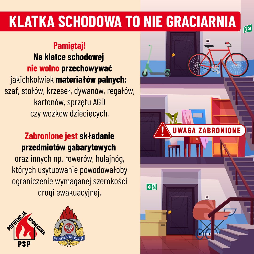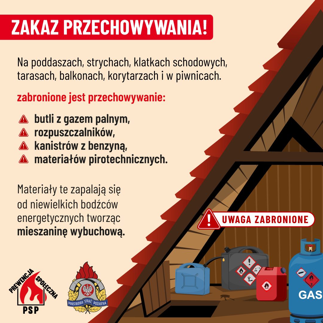 Strażacy przypominają, że zgodnie z przepisami w pomieszczeniach piwnicznych, na poddaszach, strychach, klatkach schodowych i korytarzach NIE wolno przechowywać materiałów niebezpiecznych pożarowo.