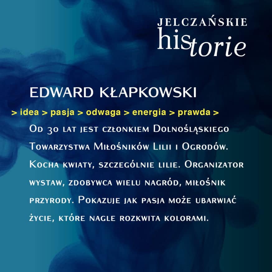 Kocha kwiaty - uważa, że lilie są jak ludzie, potrzebują jedzenia, picia i miłości. On im to daje. Edward Kłapkowski, bo o nim mowa, to członek Dolnośląskiego Towarzystwa Miłośników Lilii i swoją pasją chciałby się podzielić z mieszkańcami. Pasję Pana Edwarda, związaną z tymi anielskimi kwiatami, poznaliśmy podczas HiStorii - projektu ukazującego ludzi Jelcz-Laskowic, których hobby determinuje całe życie. Pan Edward jest entuzjastą piękna i różnorodności jednej z najbardziej eleganckich roślin ogrodowych. Wraz z przyjaciółmi chce z Państwem podzielić się bogactwem ich odmian, zachwycającym pięknem i zapachem.