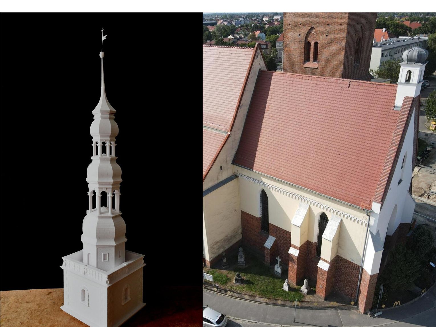 * Jako uzupełnienie badań wykonano również model dawnego hełmu kościoła (widoczny na jednym ze zdjęć), znanego z dawnych rysunków i fotografii. W planach pozostaje modelowe odtworzenie pozostałych faz budowlanych.