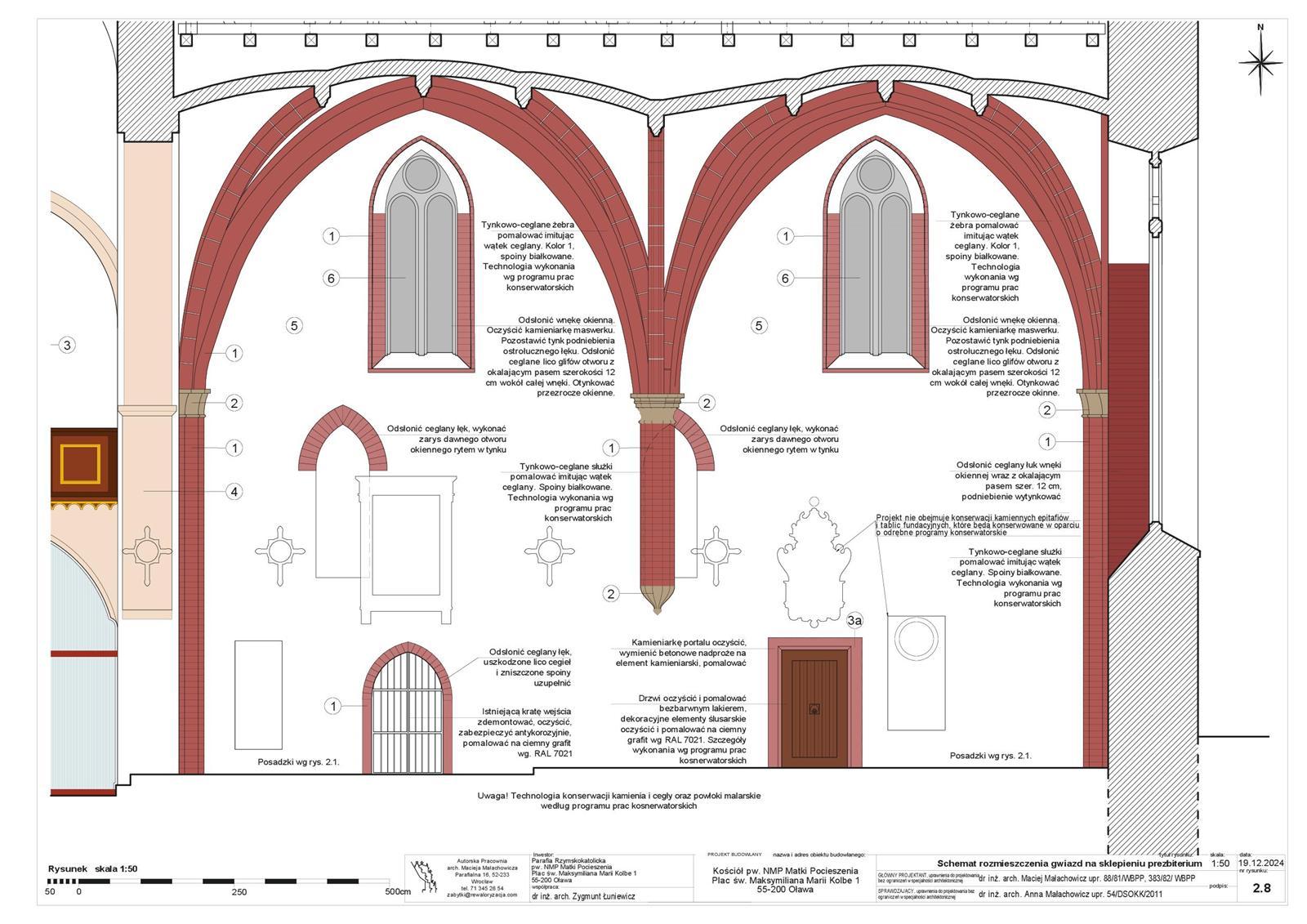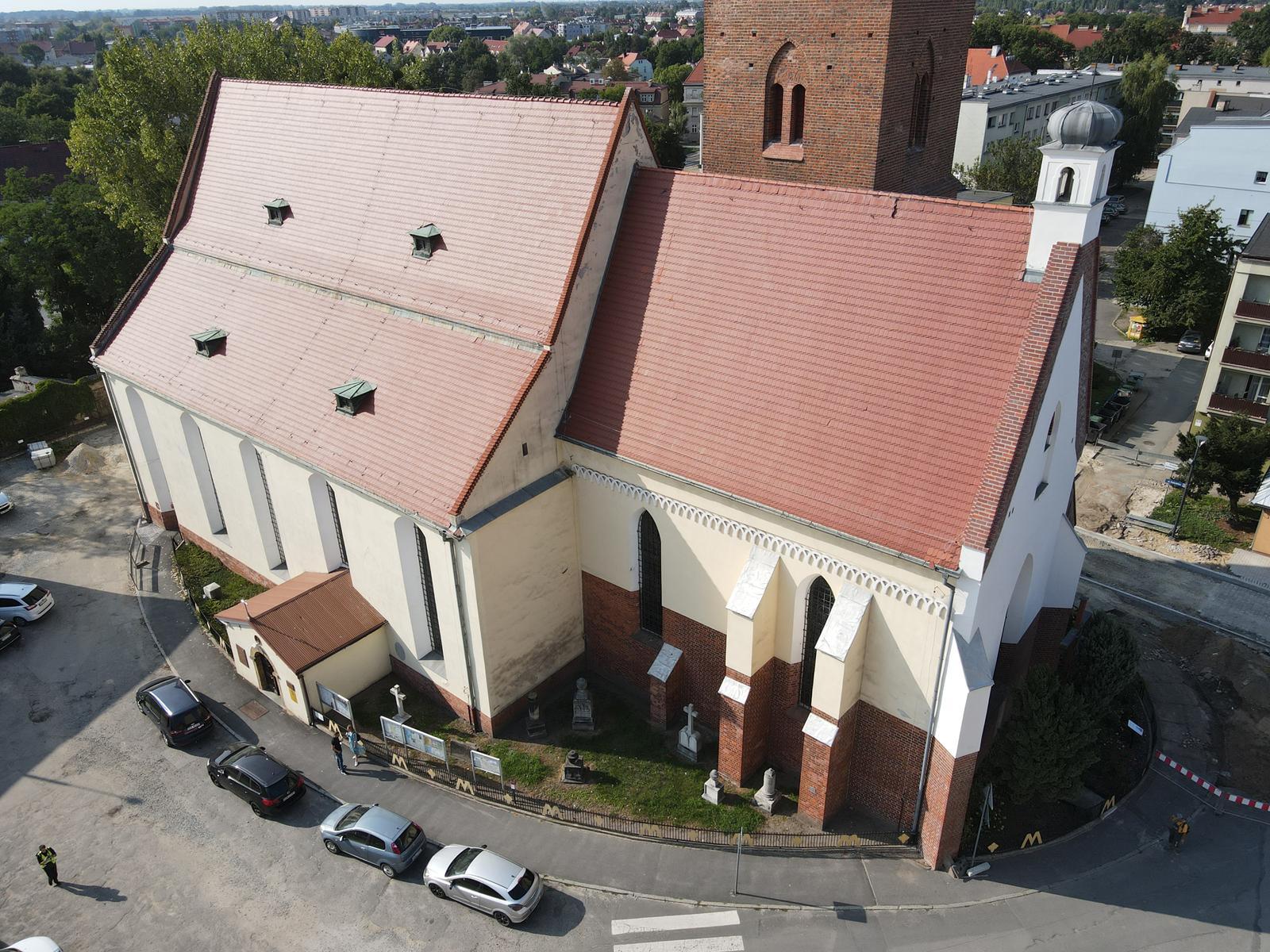 * w stosunku do istniejącego stanu badań, udało się zaobserwować nieznaną dotychczas fazę budowlaną kościoła. Obserwowane z zewnątrz prezbiterium, na podstawie dekoracyjnego fryzu arkadkowego oraz form trójdzielnego maswerku (ozdobnej kamieniarki) okna wschodniego, pozwala się datować na czwartą ćwierć XIII w. Jednakże, oględziny i pomiary ukrytej pod połacią dachu zakrystii ściany północnej pozwoliły zaobserwować, że prezbiterium było pierwotnie znacznie mniejsze, a dopiero później rozbudowano je do obecnej wielkości. Data budowy tego wcześniejszego, mniejszego prezbiterium to ok. połowy XIII w. W przygotowanym projekcie założyliśmy oczyszczenie od wnętrza części ściany północnej z tynku, aby ukazać ten najstarszy, dotąd ukryty fragment muru.