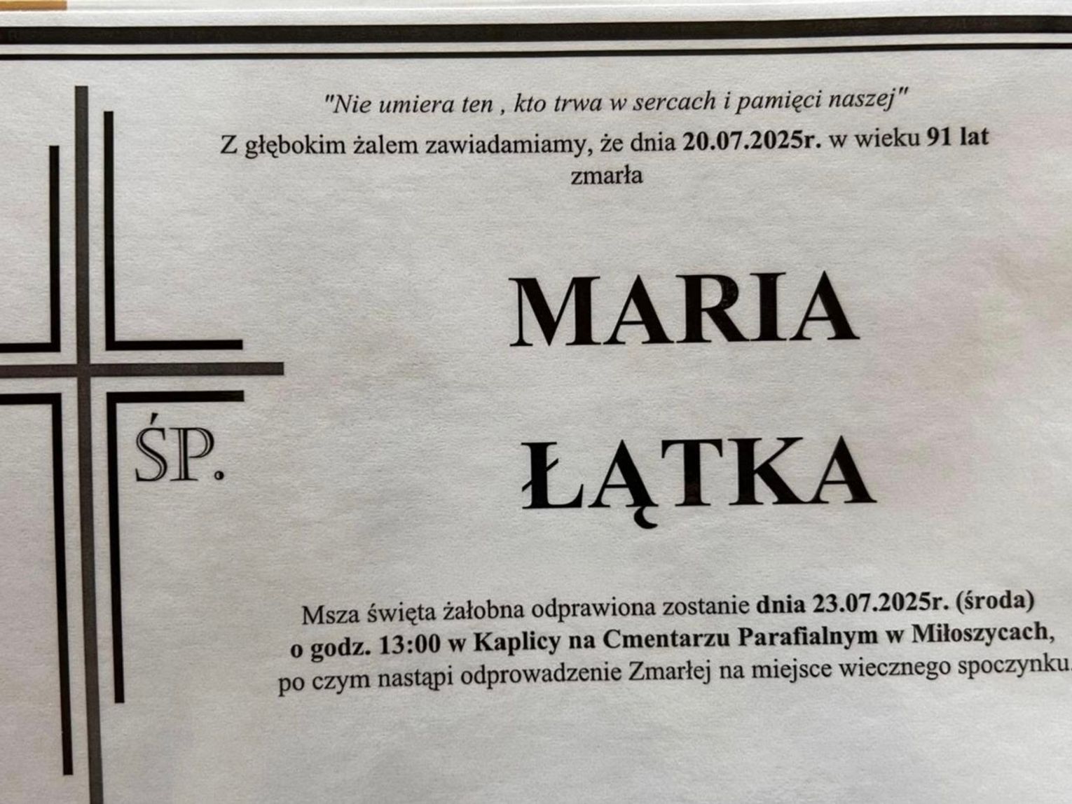O jej śmierci poinformował facebookowy profil sołectwa Dziuplina: - Z przykrością informujemy, że po ciężkiej chorobie zmarła nasza mieszkanka Pani Maria Łątka. Przeżyła 91 lat. Świeć Panie nad Jej Duszą. Rodzinie składamy najszczersze wyrazy współczucia.